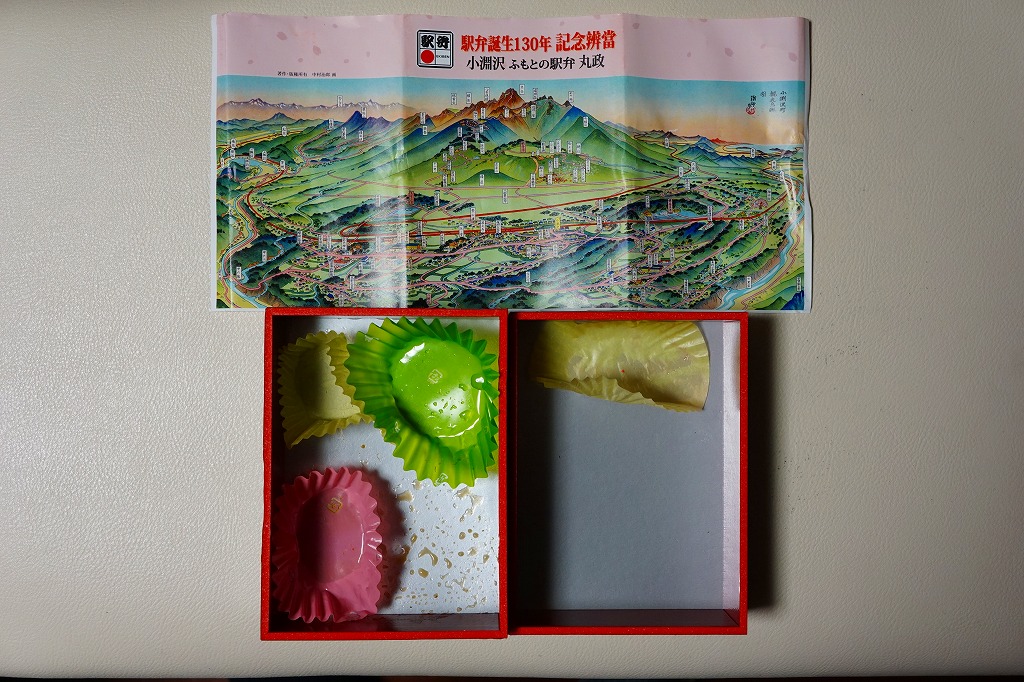 おしながきにすればいろいろ入っているが、御飯もおかずも見栄えと分量が貧弱で、千円の価格に見合わないのではと思った。駅弁が名物だと自信を持って名乗る小淵沢の駅弁はもっと元気なはずで、山梨の県都へも同じくらい力を入れてあげてもよいのに。2012年頃に売り止めた模様。