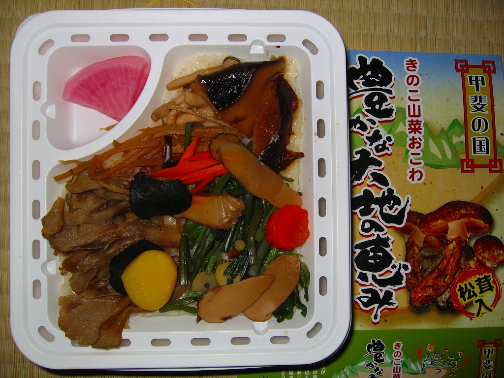 キノコの種類を稼ぎ、パッケージのデザインに加えて松茸とトリュフを添付した、催事で映える駅弁に思えた。スーパーやデパートで小淵沢駅の駅弁として大々的に売られる一方で、公式サイトでの現地情報は「駅売店では、販売準備中のため、予約対象品です。」という疑義駅弁。この駅弁は現存しない模様。