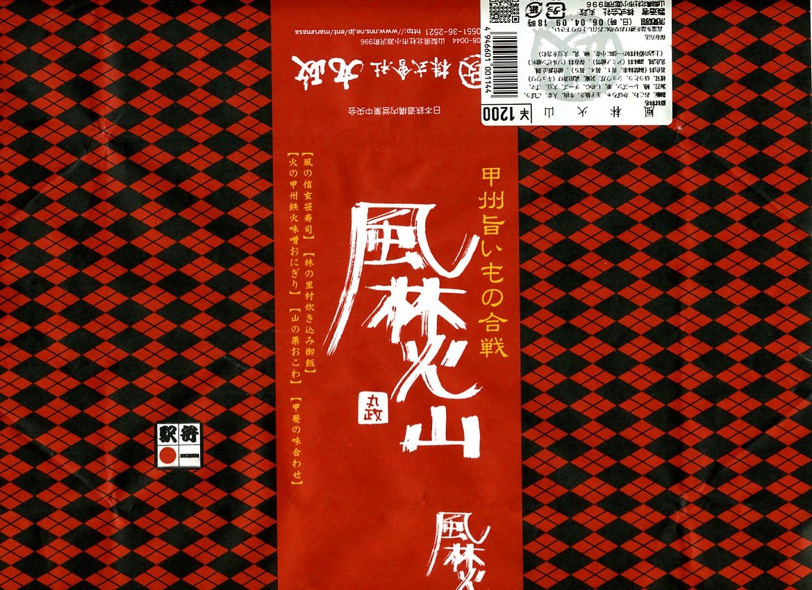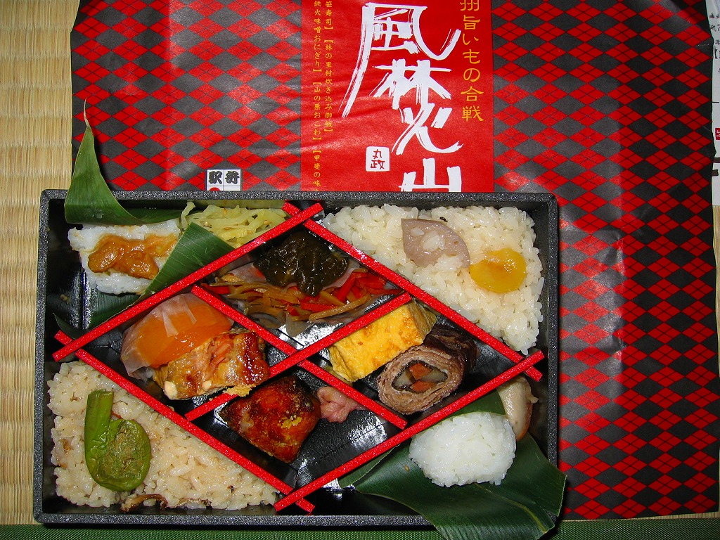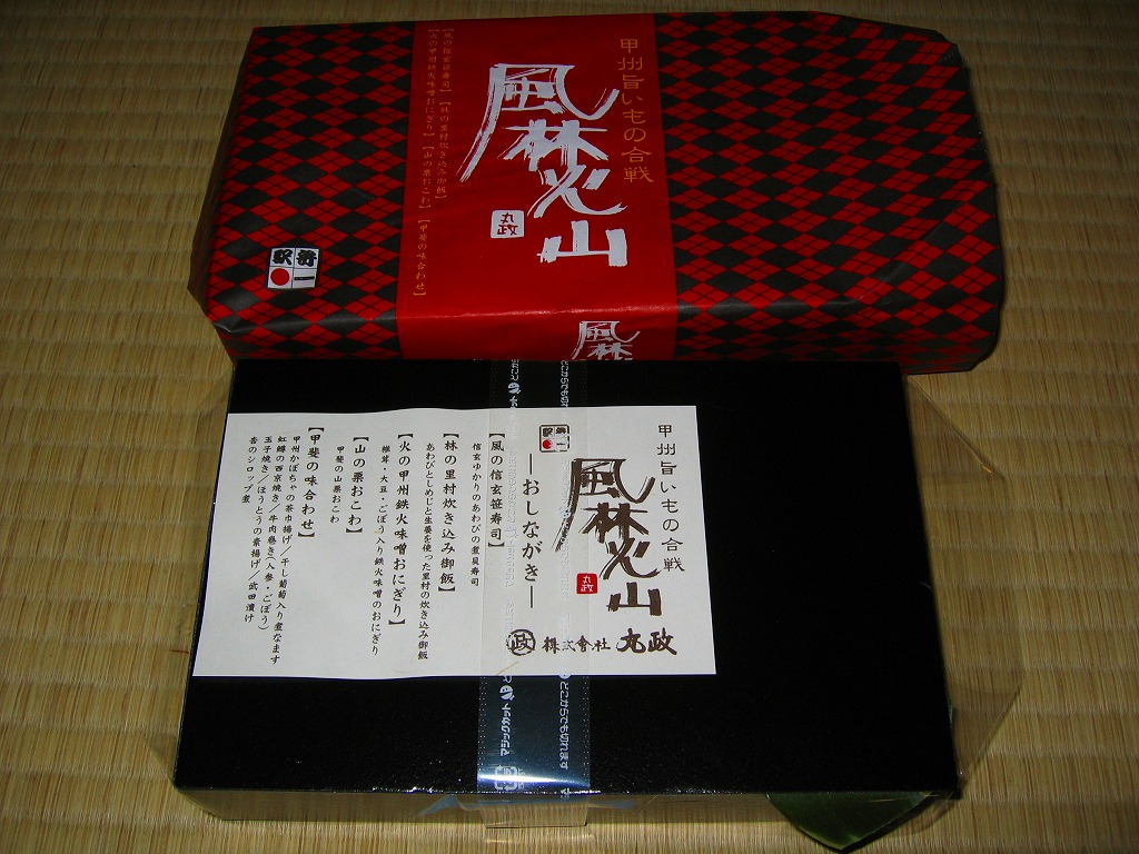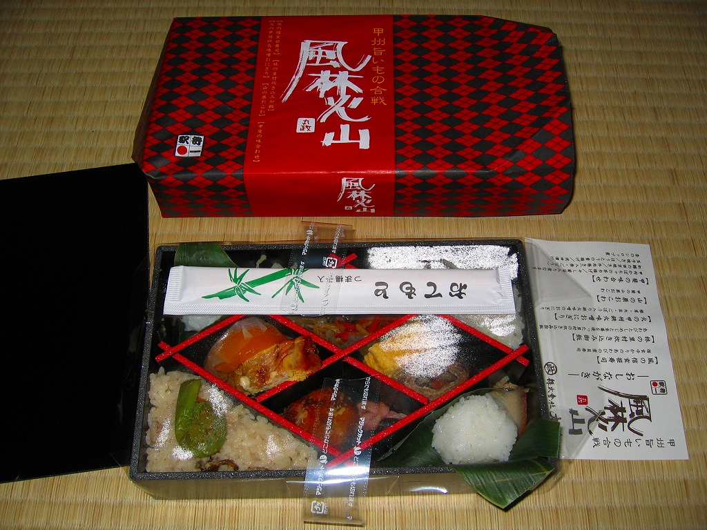 武田菱状に仕切られた中身は、その外側に「風の信玄笹寿司」ことアワビ煮貝添え笹寿司、「林の里村炊き込み御飯」ことアワビとシメジの炊込飯、「火の甲州鉄火味噌おにぎり」こと鉄火味噌載り笹御飯、「山の栗おこわ」こと山栗おこわ、内側に「甲斐の味あわせ」として牛肉巻、玉子焼、紅鱒西京焼、ほうとう揚げ、かぼちゃ茶巾揚げ、アンズのシロップ漬など。値段は高いがどこまでも本格派、思い出作りの旅にはとてもふさわしい昼食になると思う。価格は購入時で1,200円、2014年時点で1,350円。常にある駅弁でなく、断続的あるいは間欠的に発売された。2014年までの販売か。
