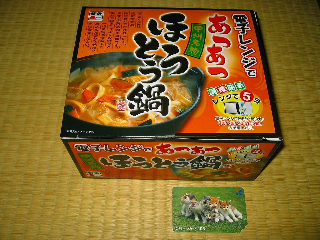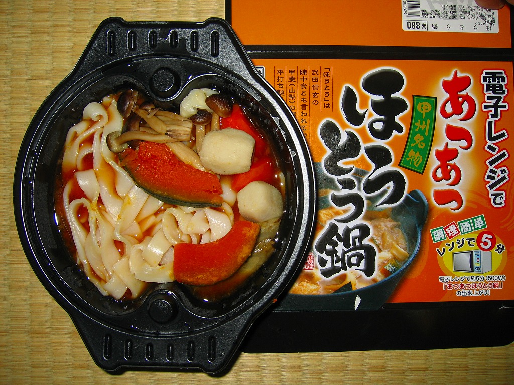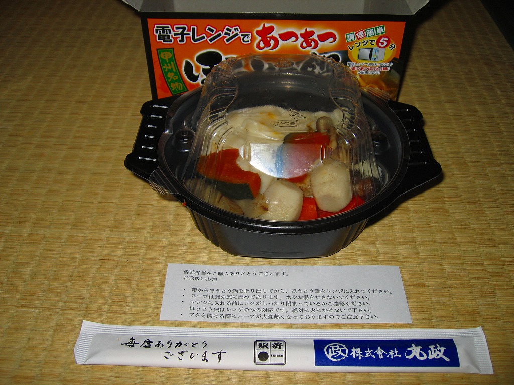 発売と消滅を繰り返す、山梨県内のほうとう駅弁。今回はコンビニでおなじみの汁物固結技術を利用してきた。汁物を弁当や惣菜として販売するために、スープをゼラチンでゲル状に固め、これを電子レンジでの加熱により溶かして消費するもの。これに対応して、お湯を足すな、火にかけるな等の注意書きが紙片で添えられる。ゼラチンは味に影響せず、溶けたゼラチンは冷めても固まらないとされるが、この駅弁は冷めるにつれて汁が再固結し始めた点が気になった。