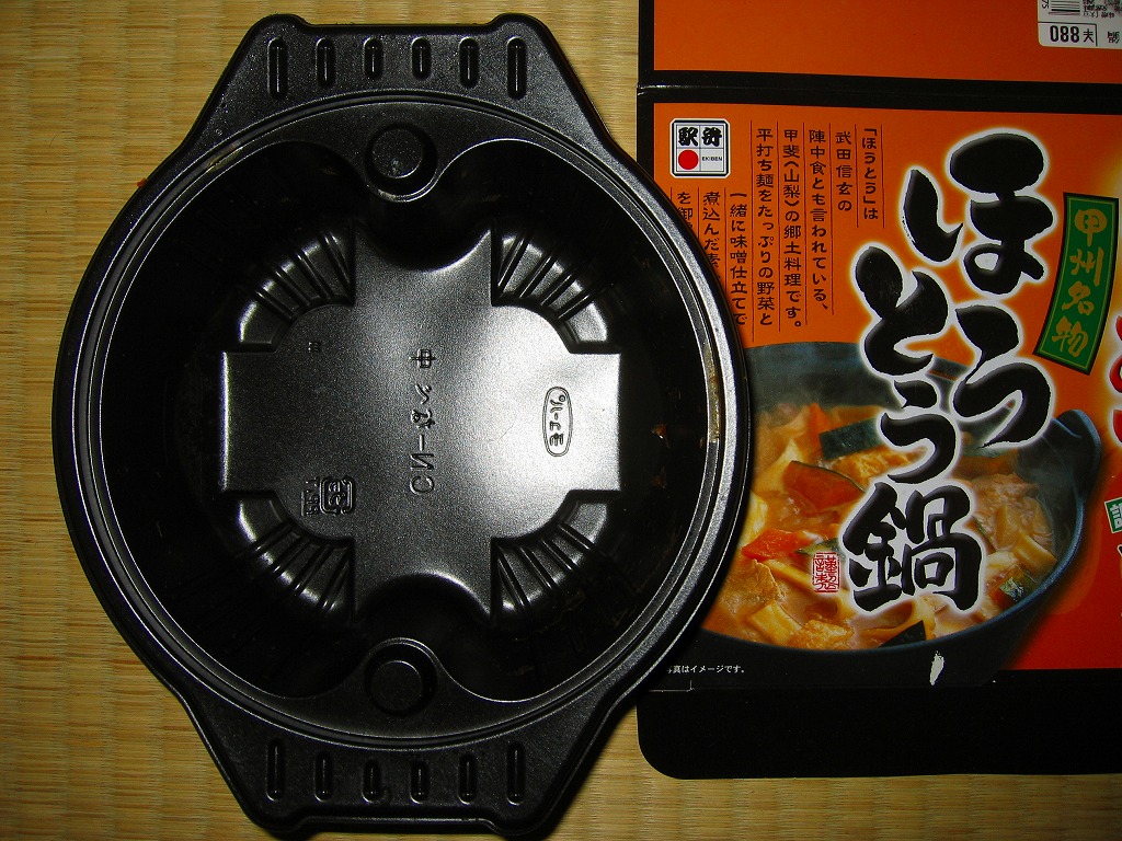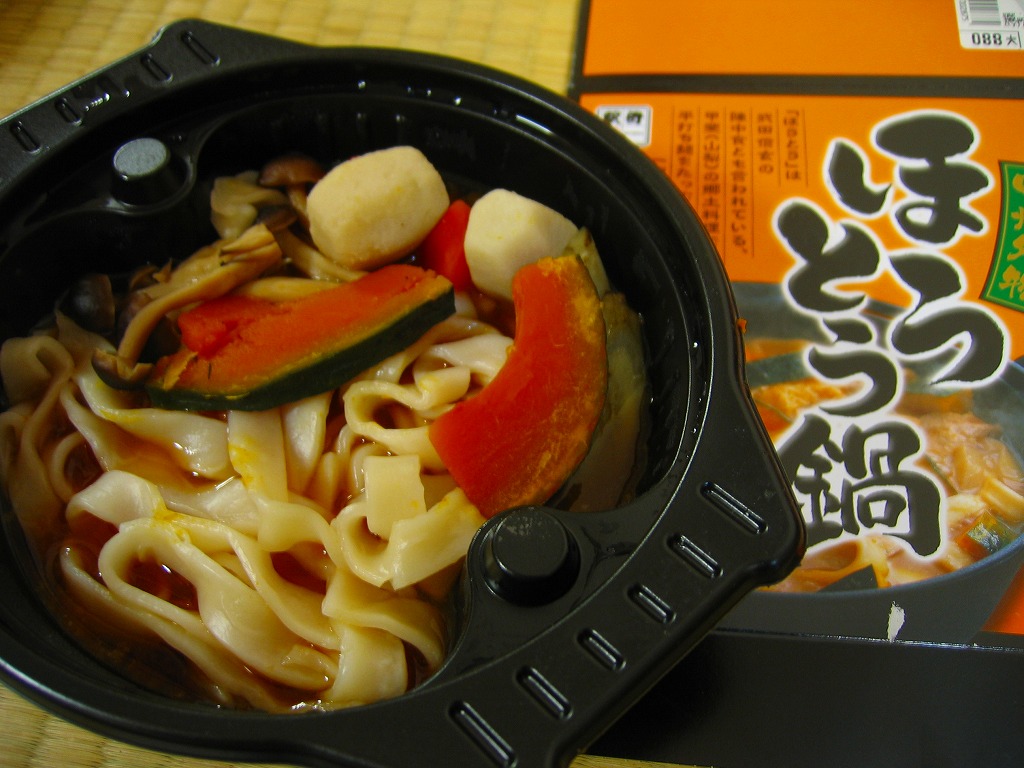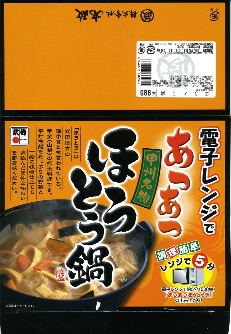 2009(平成21)年1月の発売は、同年同月の京王百貨店駅弁大会に向けた投入か。土鍋型のプラ製トレーに凸状の透明なふたをかぶせ、駅弁の名前に山梨名物ほうとう鍋の写真を掲載したボール紙の箱に詰める。中身は平たい麺の上にカボチャ、サトイモ、ゴボウ、シメジを載せて豚肉を沈めて味噌汁に漬けたもの。煮込みのどろっとした感じの薄い、カボチャと麺がたっぷりの、すっきりした鍋うどん。2014年時点で現存しない模様。