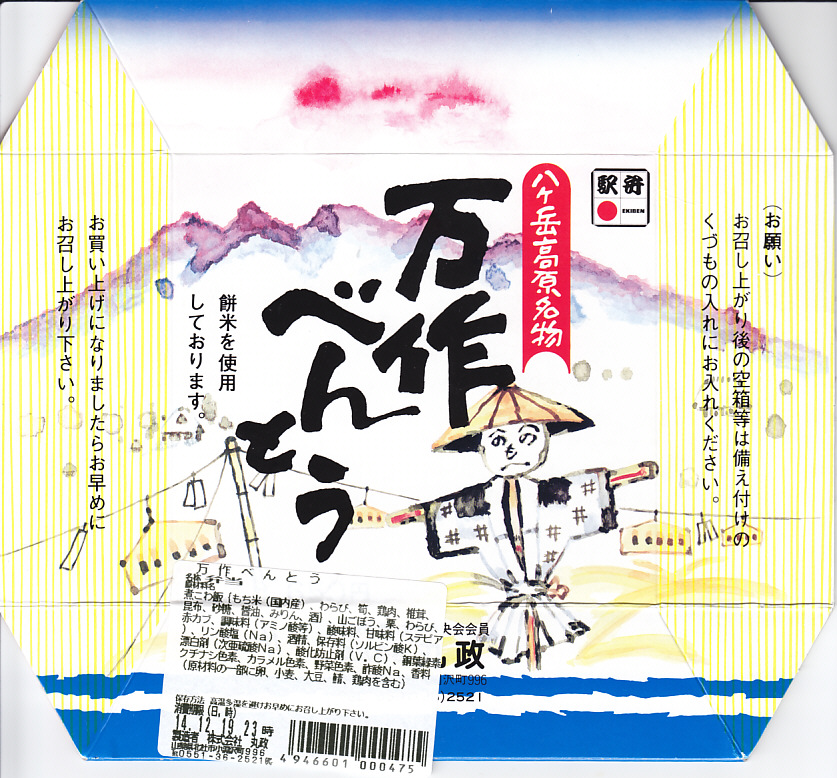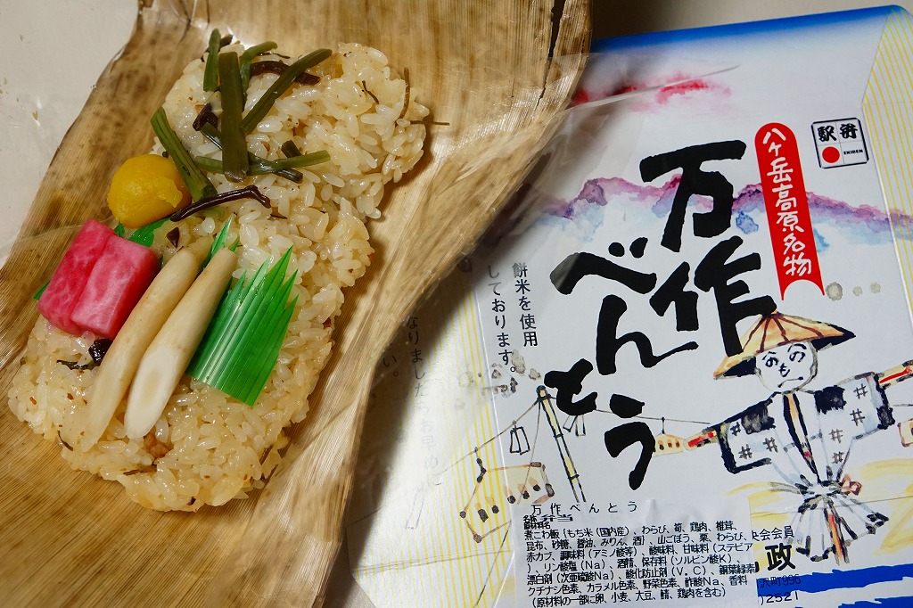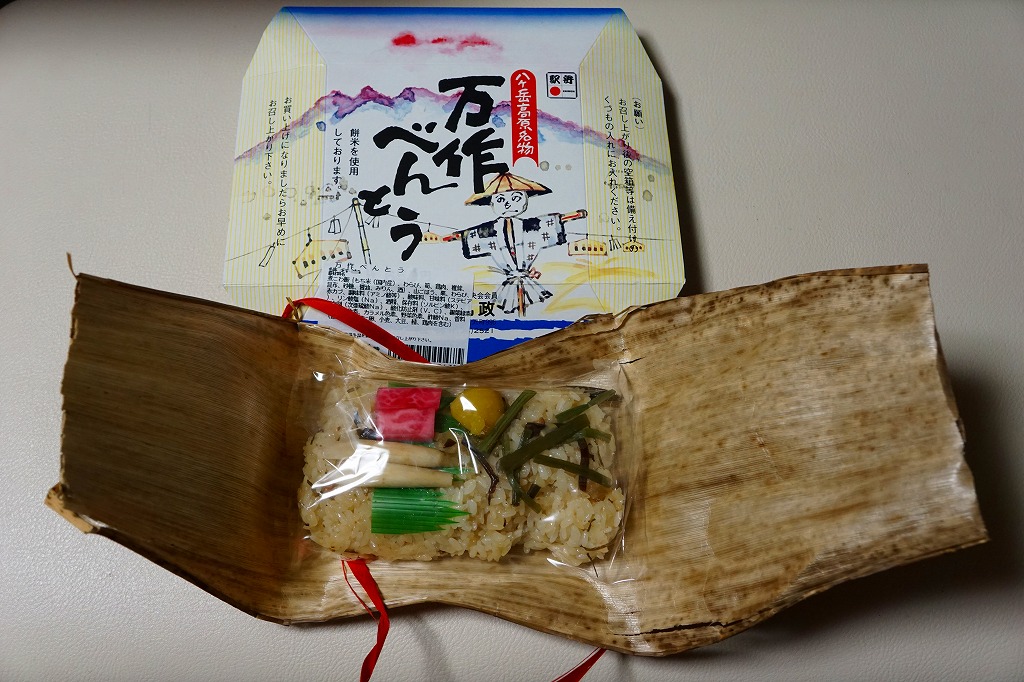 昭和50年代に売られた、当時の小淵沢駅の名物駅弁。ワラビ、タケノコ、山ごぼう、シイタケ、赤カブ、クリなどを使う山菜おこわ、現役当時の表現では野菜の炊込飯が、竹皮に包まれ、八ヶ岳とかかしを描いたボール紙のパッケージに収まる。地元の農家が豊年万作を祈る祭の際に作った弁当をイメージしたそうな。今回は2014(平成26)年12月にのみ、東京駅の駅弁売店「駅弁屋 祭」で売られた模様。2022年の10月から11月までは、日本鉄道構内営業中央会の鉄道開業150年記念復刻駅弁企画により、同月から期間限定で販売された31社34駅弁のひとつとして、小淵沢駅で再販された。