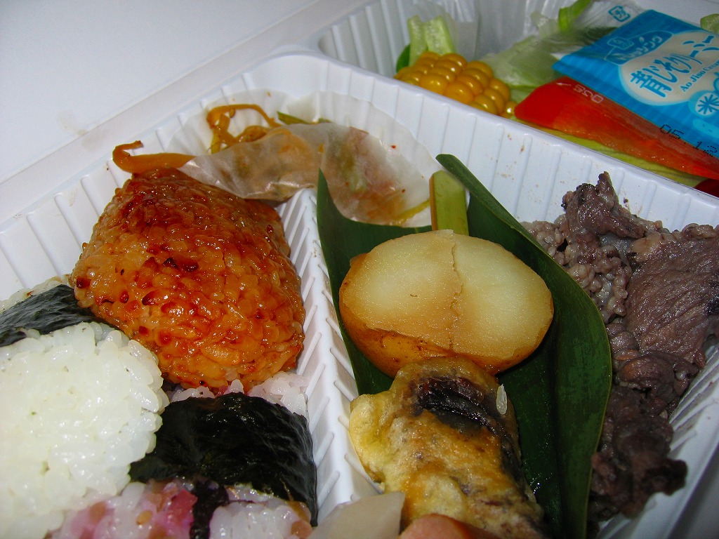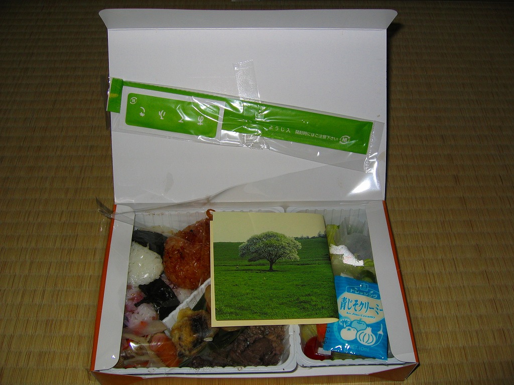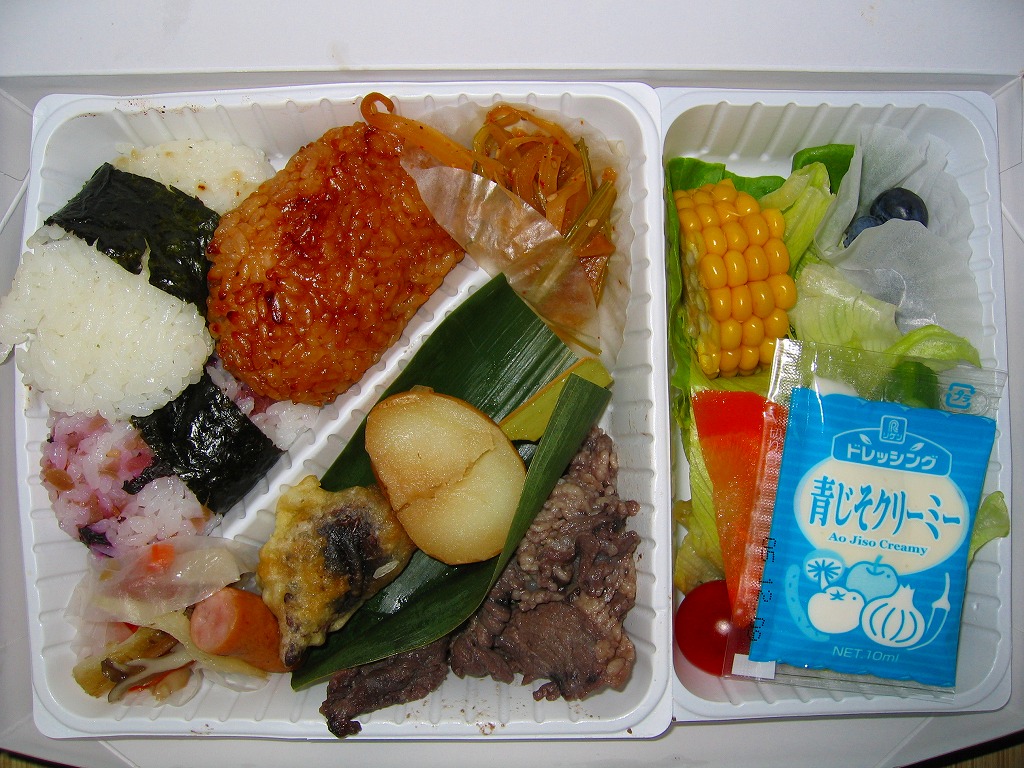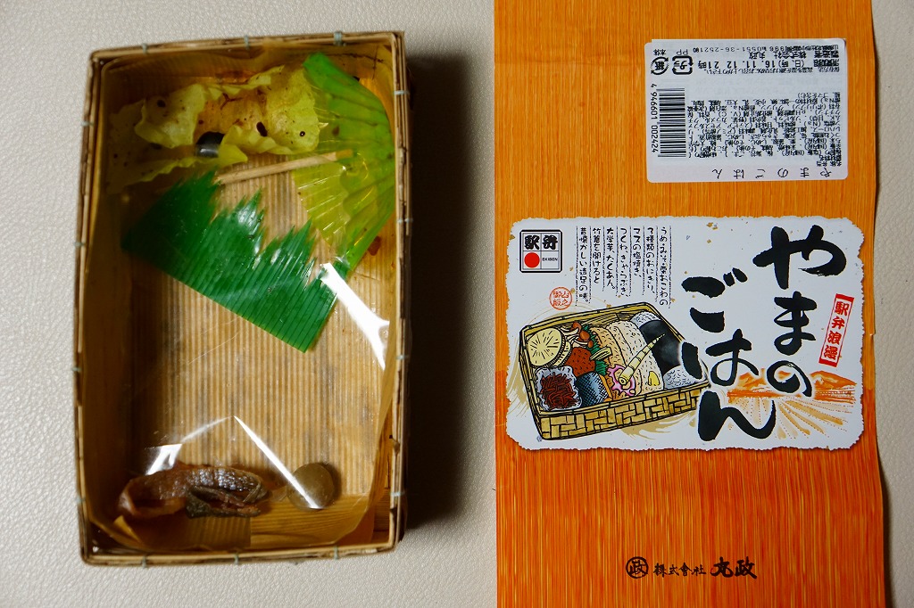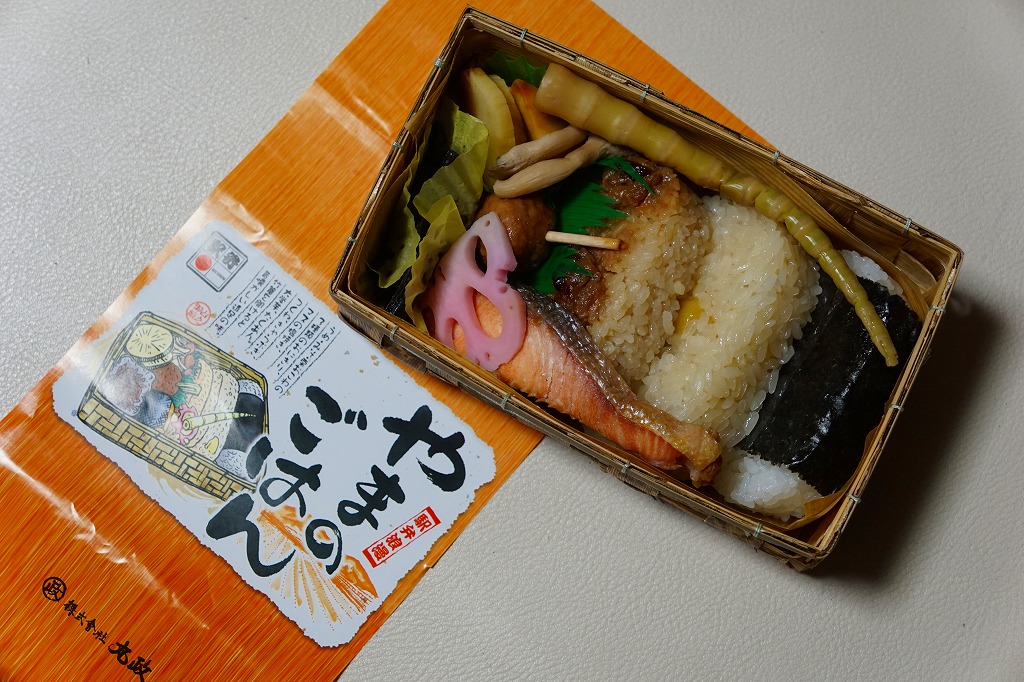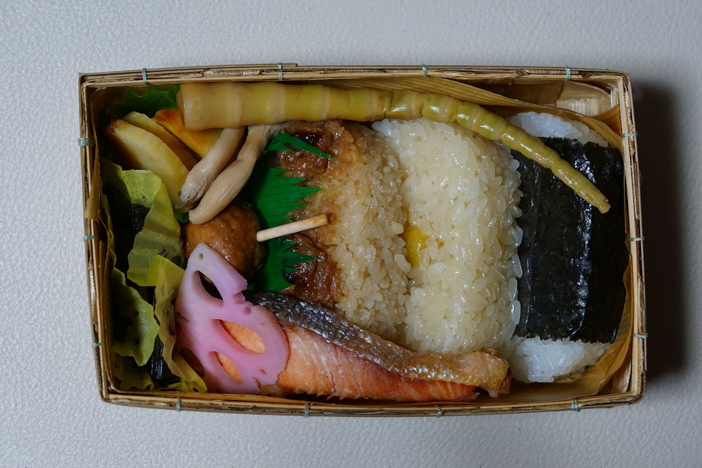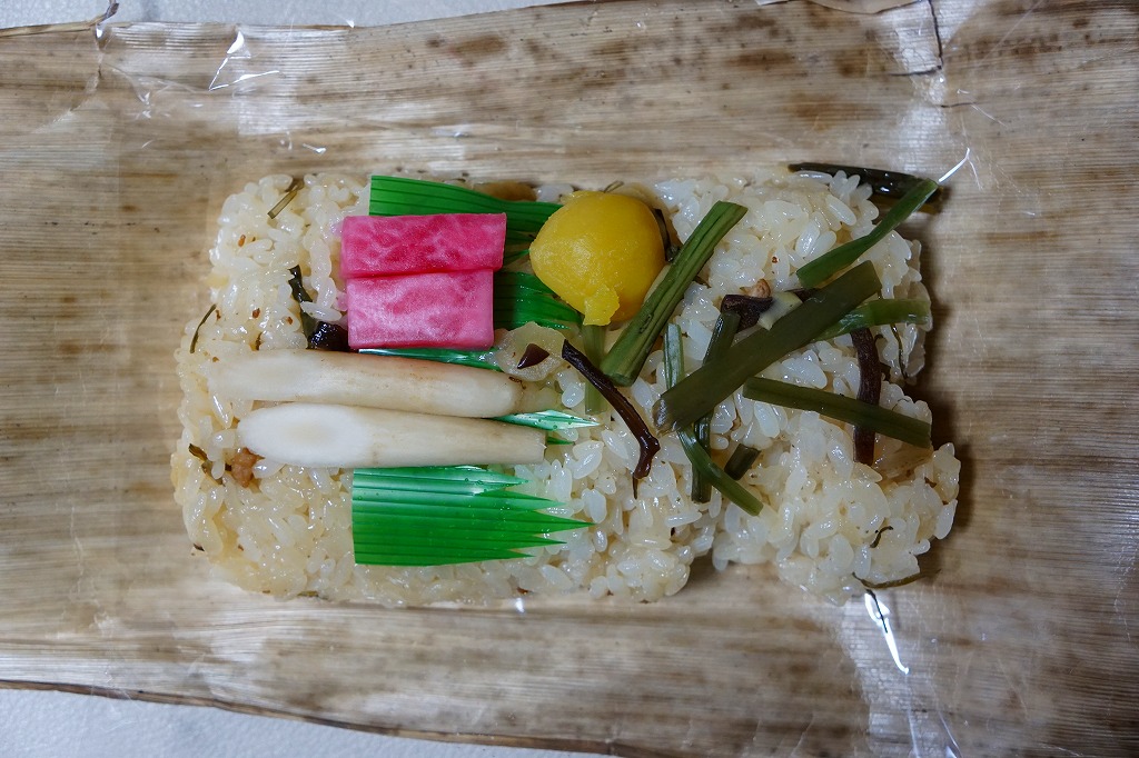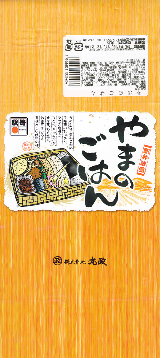2000(平成12)年4月10日の駅弁の日に、発売またはリニューアルか。駅弁業界で最近流行の竹皮製容器に、分かりやすく微笑ましい絵柄の掛紙を巻いて、プラ帯で留める。中身は梅+海苔、栗しめじおこわ、味噌焼のおにぎり、というより円形で平板の飯が1個ずつと、塩マスや鶏つくねやタケノコやレンコンに大学芋など。つまり、おにぎり弁当。