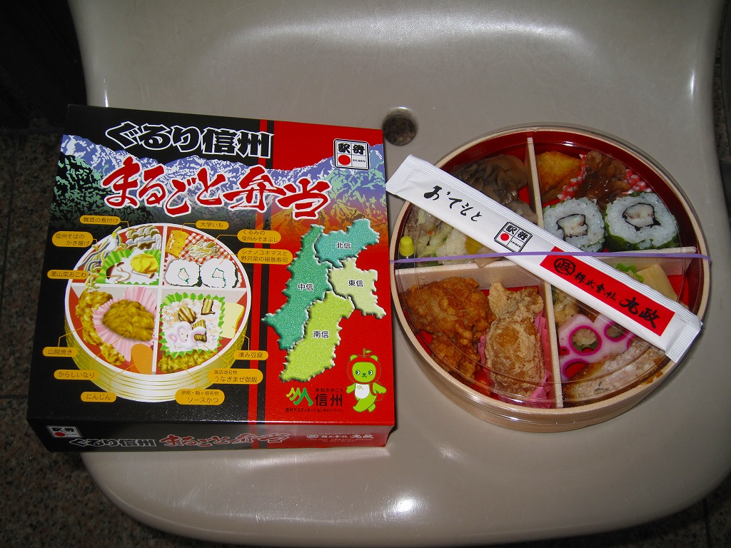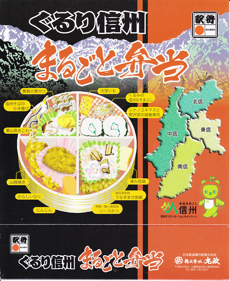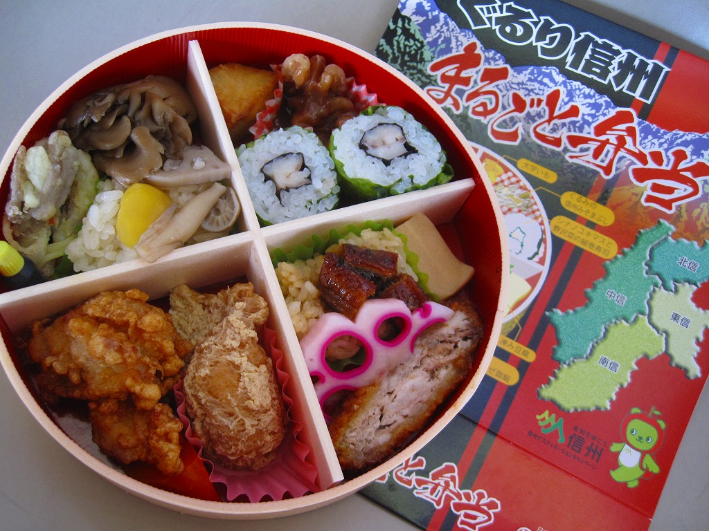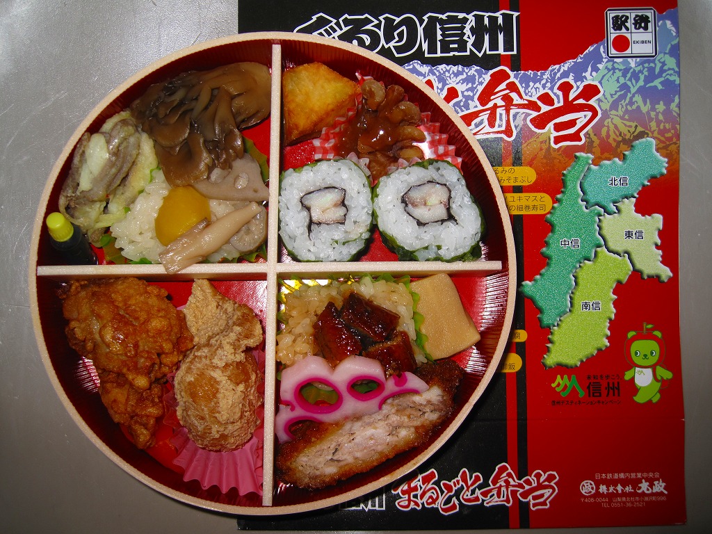 2010(平成22)年10月から12月までのJRグループ「信州デスティネーションキャンペーン」や、この秋冬の駅弁大会シーズンに向けた投入か。真円形の容器に透明なふたをして、長野県と山並みと中身のイラストを描いたボール紙の枠にはめる。中身はパッケージに書かれるとおり、マスと野沢菜の巻寿司にクルミ味噌に大学芋、ウナギ飯にソースカツに凍豆腐、からしいなりに鶏山賊焼にニンジン、栗山菜おこわにそばかき揚げに舞茸煮。
