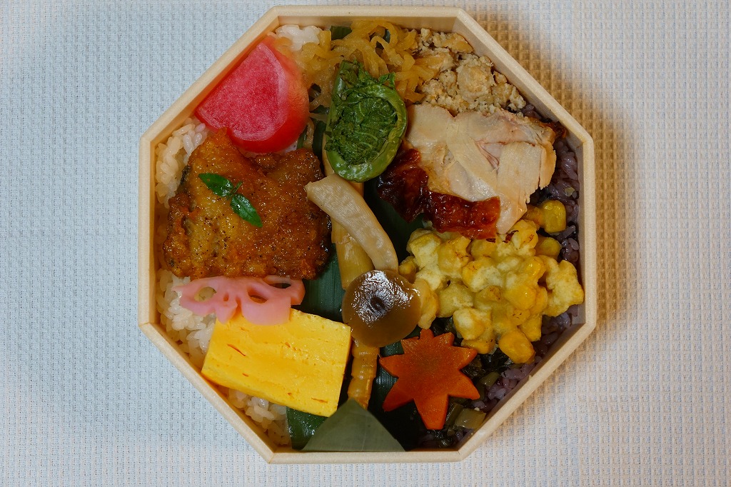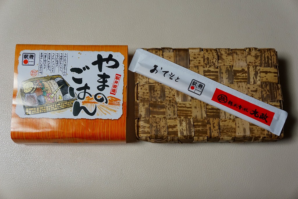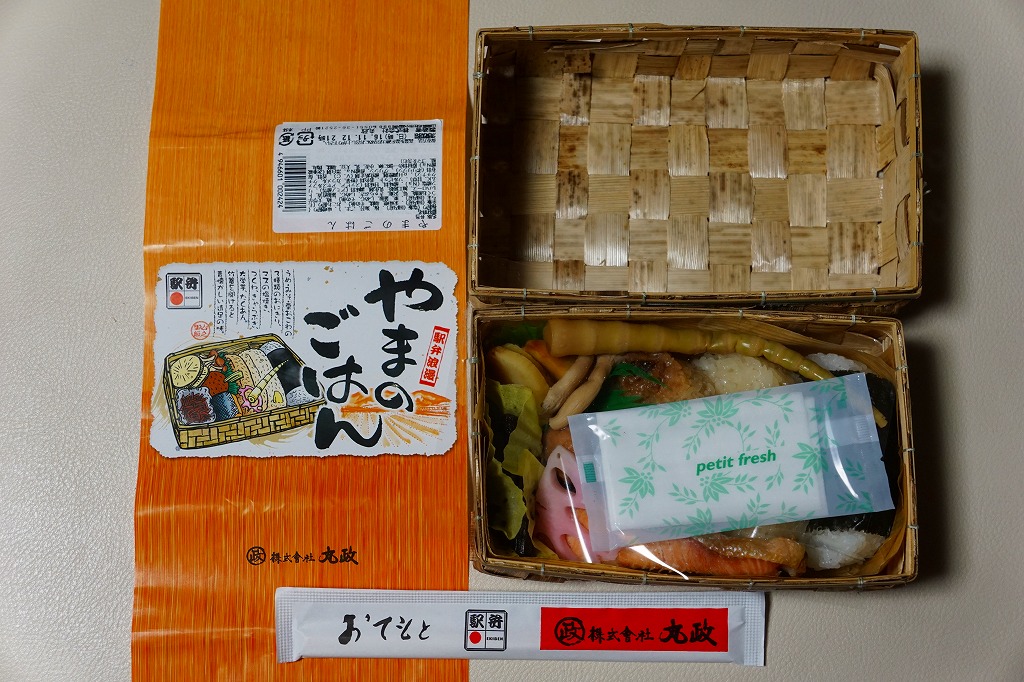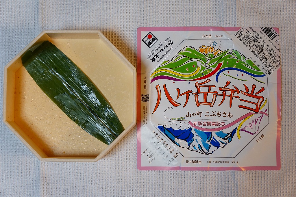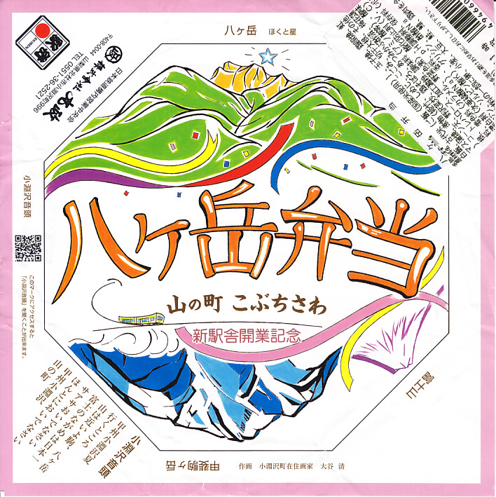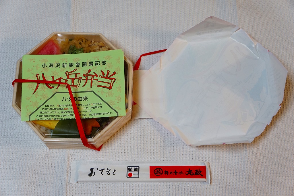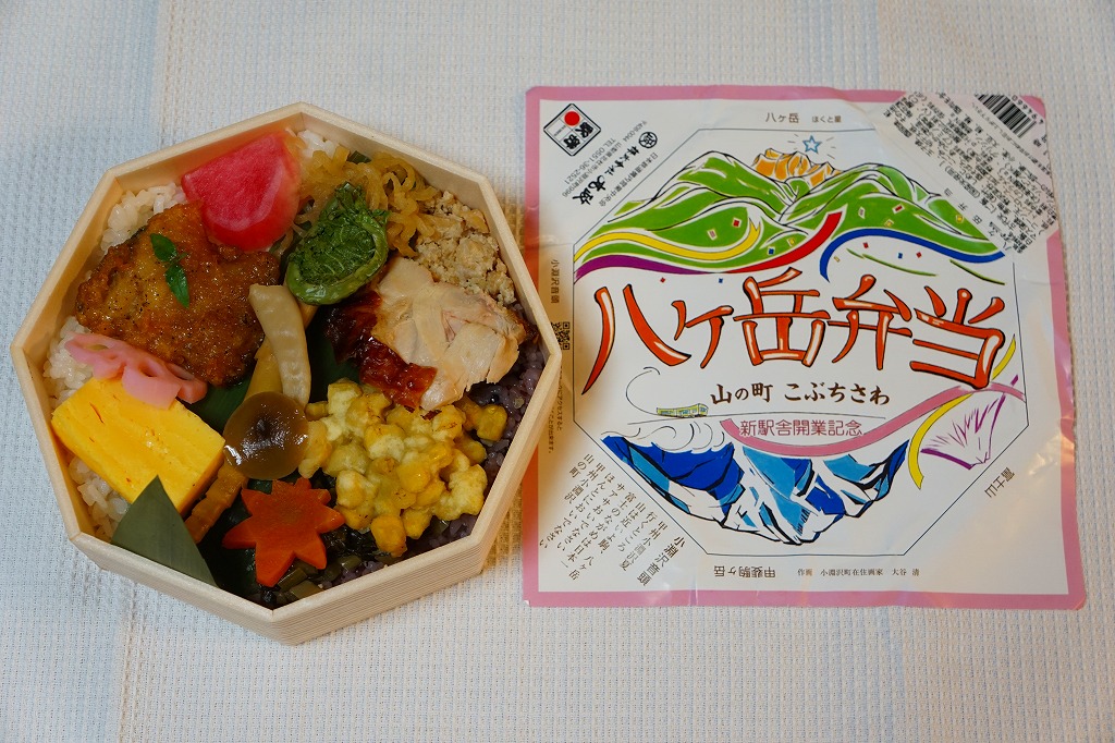 小淵沢駅の新駅舎の開業を記念して、2017(平成29)年7月3日に発売。JR東日本の駅弁催事では6月19日から先行販売。駅弁の名前と山を描いた掛紙は、そんな新しい駅弁を思わせない、昭和風のデザインだと思う。正八角形の容器に、白飯と古代米の赤飯を詰め、鶏照焼、ベニマス蒲焼、コーン天、野沢菜、玉子焼、山菜、漬物などで覆う。そんな中身も、まるで昭和の駅弁を復刻したような印象。年内に終売か。