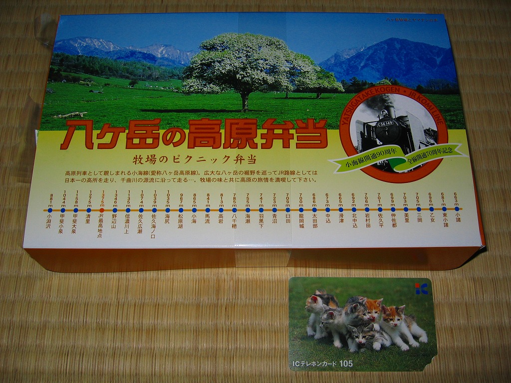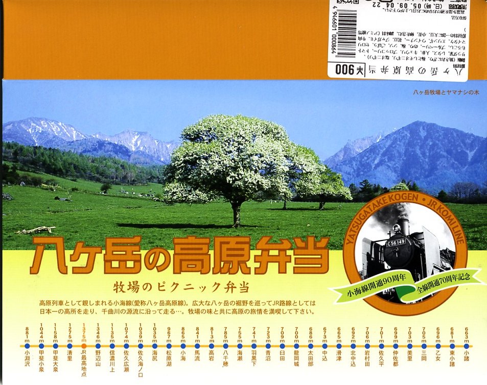 小海線の開業90周年と全通70周年を記念して、2005(平成17)年5月21日に発売。八ヶ岳を背にしたヤマナシの樹木の写真の下に、小海線全駅の駅名と標高を記したボール紙製長方形の容器を、プラ帯で留める。中身は焼おにぎりと梅しそおにぎりと塩おにぎり、レタスやキュウリなどの生野菜、花豆天にソーセージにジャガイモにブルーベリー風味牛焼肉など。パッケージや駅弁の名前は「高原野菜とカツの弁当」に被るが、中身は別物。記念駅弁ということで、2005年内に売り止めた模様。
