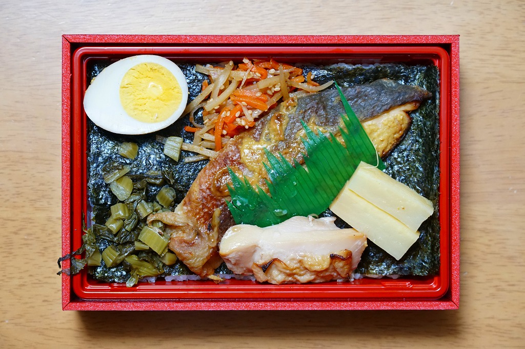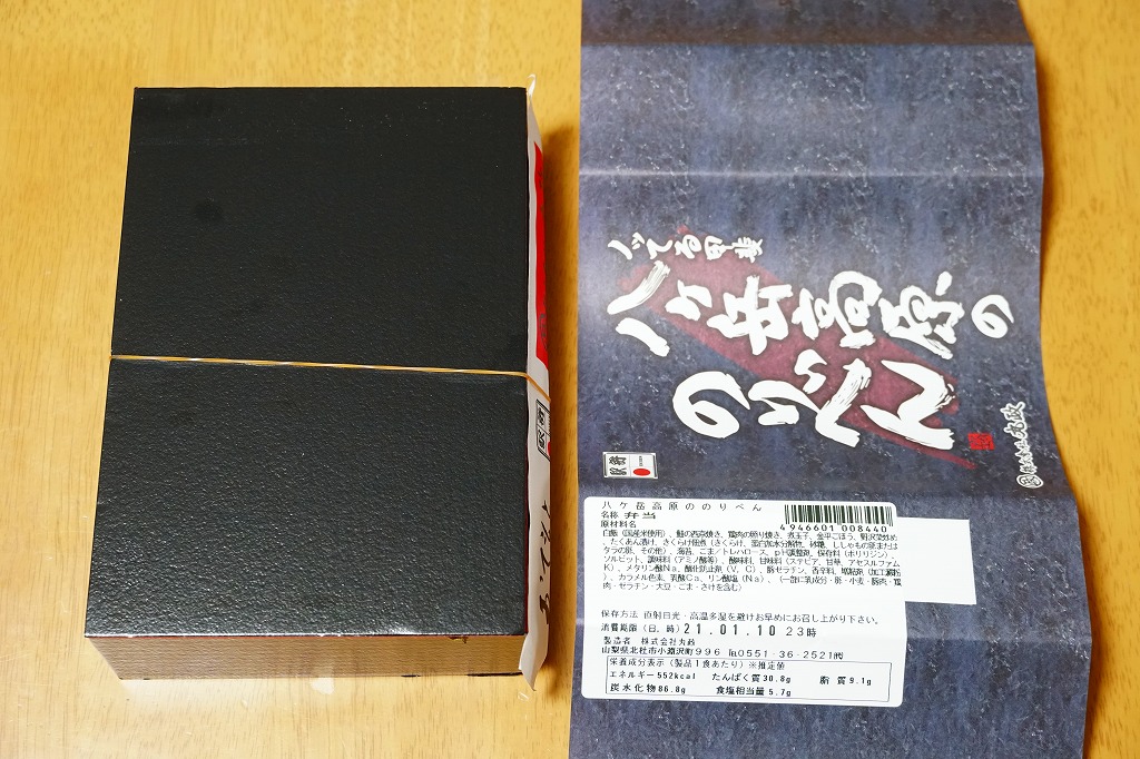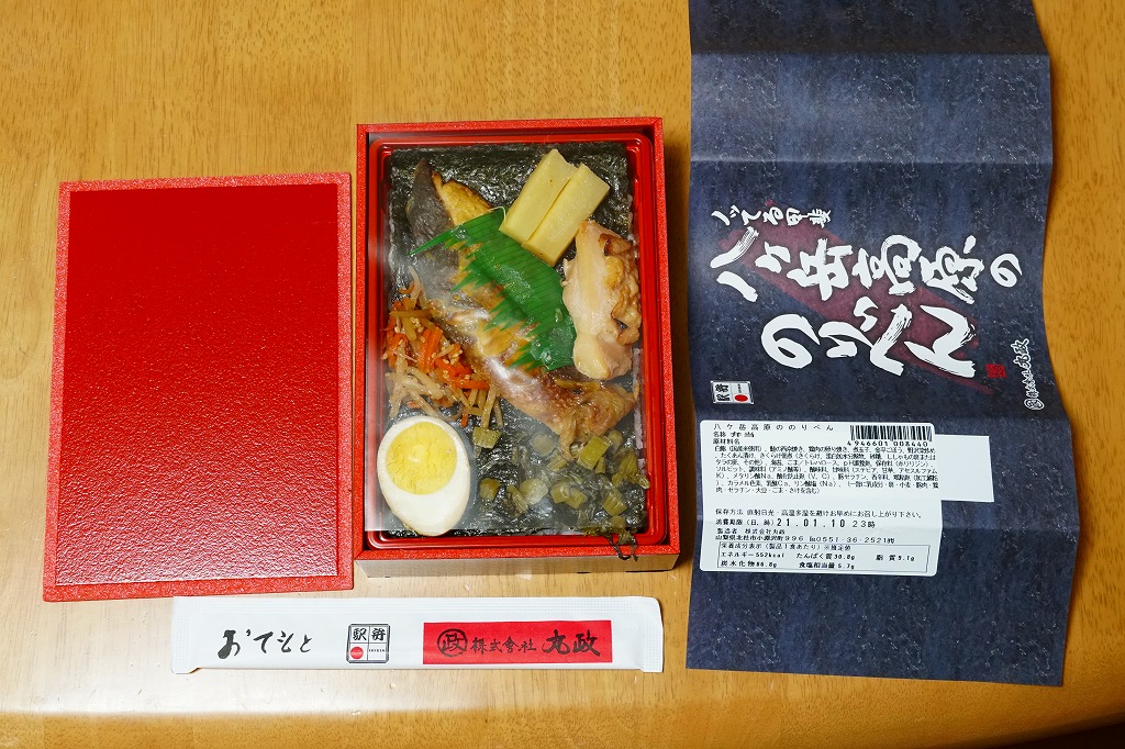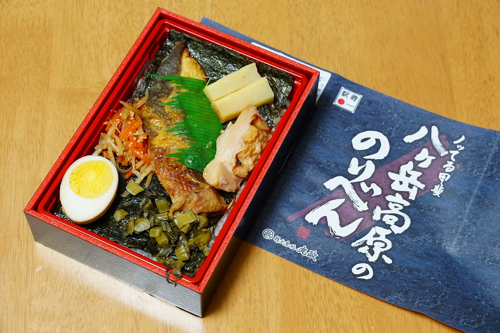 秋冬の駅弁大会シーズンに向けた、2020(令和2)年秋の新商品か。郡山駅の「海苔のりべん」の、テレビ番組での大ブレイクで徐々に広がる海苔駅弁が、小淵沢駅にやってきた。駅弁の名前を書いた掛紙の色や柄は、まるで海苔。中身は白飯を海苔で覆い、鮭の西京焼、きんぴら、野沢菜、鶏照焼、漬物、煮玉子。体裁もちゃんと海苔弁している、その高級版ないし駅弁版。半年間で終売か。