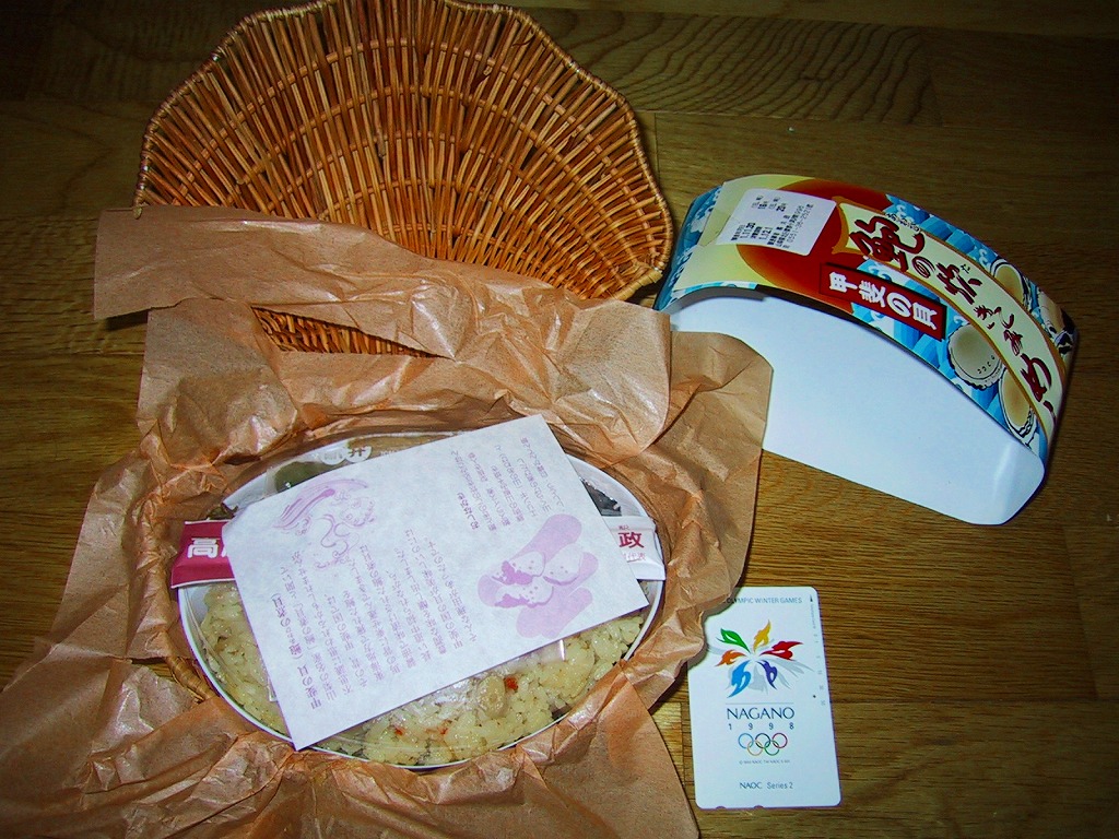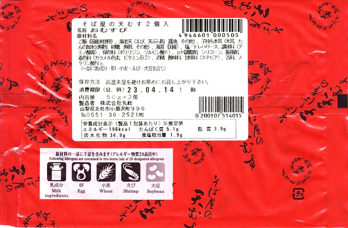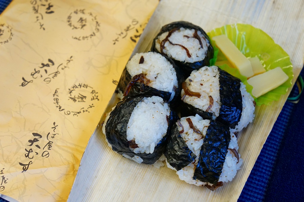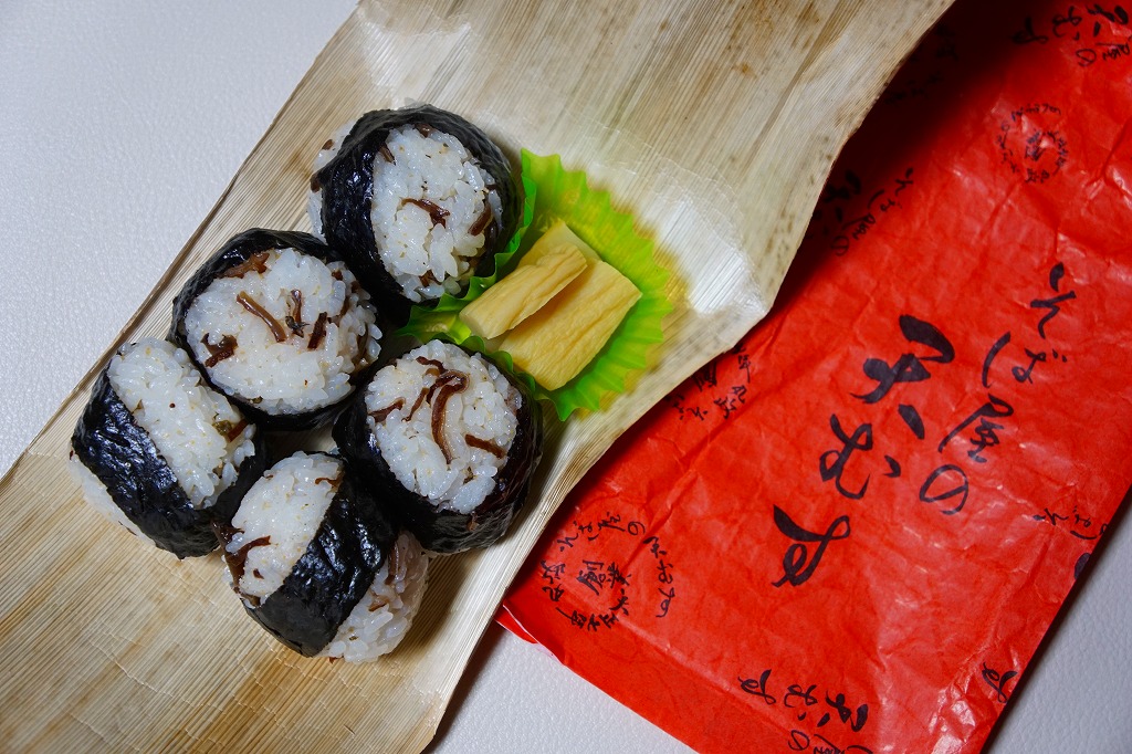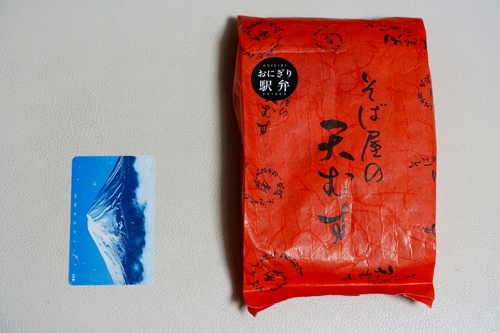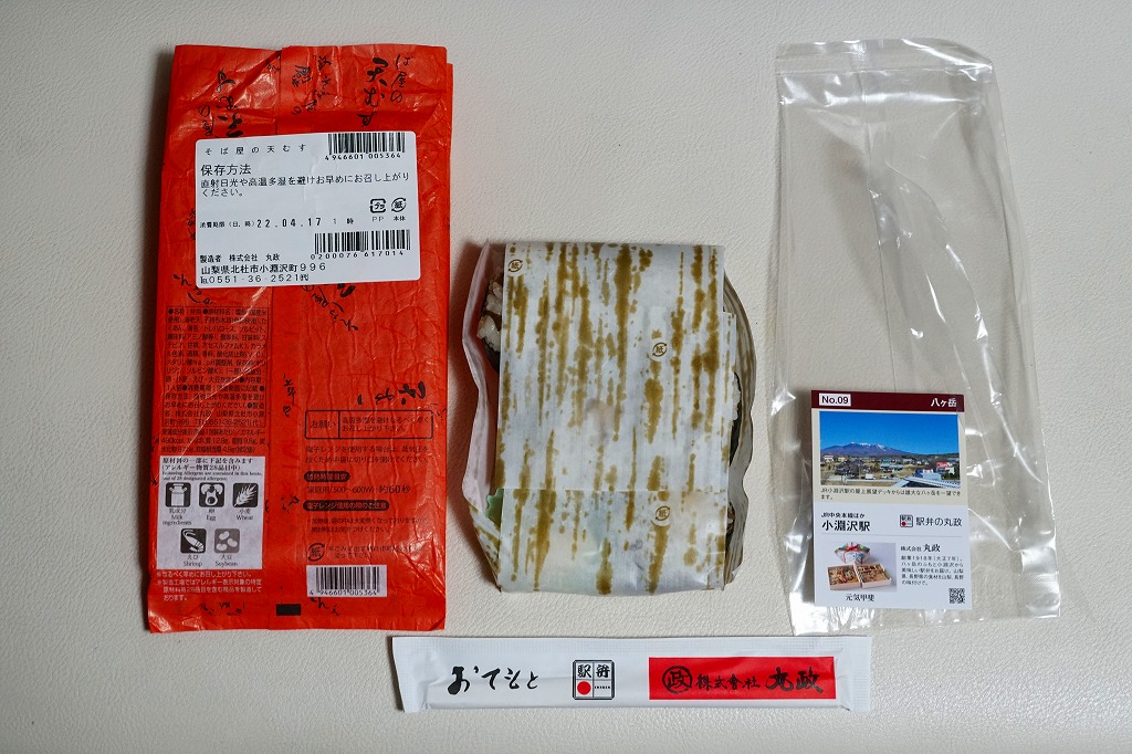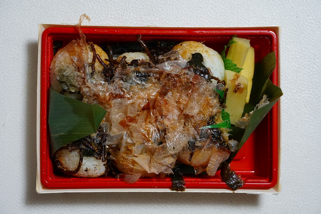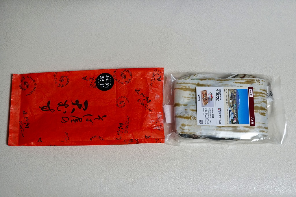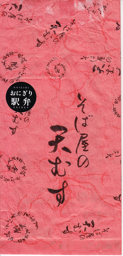 2013(平成25)年12月の発売。キクラゲの混ぜ御飯で小さなエビ天を巻く、ピンポン球くらいの大きさのミニおむすび5個とタクアンを、竹皮に包んで、紙袋に詰める。調製元は小淵沢駅の駅弁屋であるが、同時に駅そば屋や立ち食いそば屋でもあるため、この商品名で合っている。