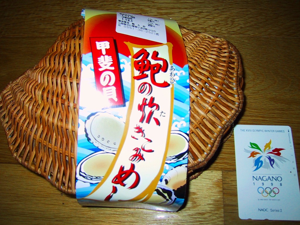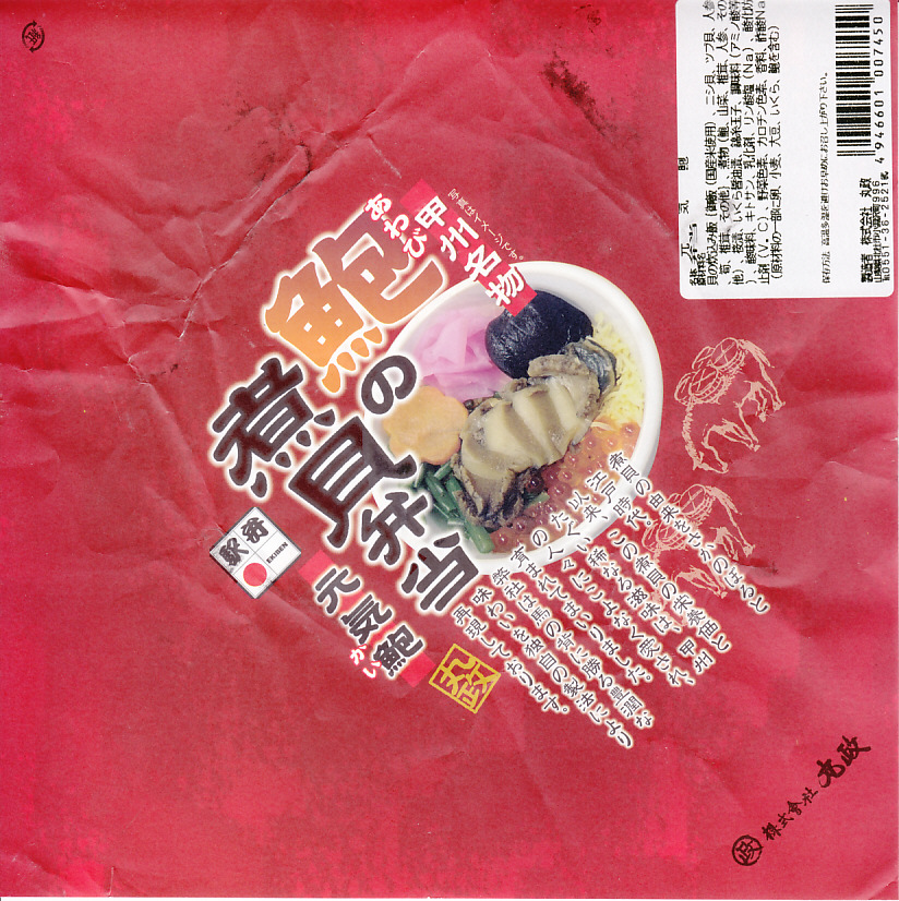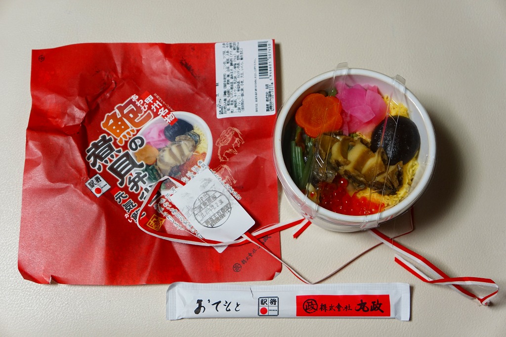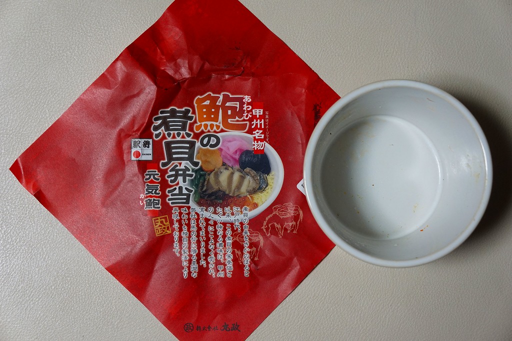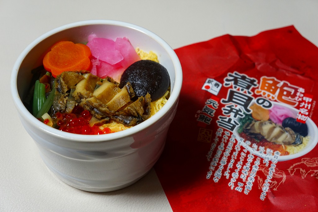 陳列に難がありそうな貝の形に編んだ竹籠の容器を使用、白いトレーを収めて、その中でアワビときのこの炊き込み御飯の上にアワビのスライス煮が載り、鶏肉・エリンギ・山くらげなどを添える。この価格の割に少量であるうえ、アワビが主に身ではなく出汁として入るため、「高原野菜とカツの弁当」か「元気甲斐」に手が伸びる。「甲斐の貝」は駄洒落ではなく、アワビの煮貝は四百年の伝統を持つ山梨県の名産品。価格は2001年の購入時で1,000円。その後しばらく見なかったが、2013年頃に1,300円で再登場した模様。価格は2017年時点で1,400円。2017年までの販売か。