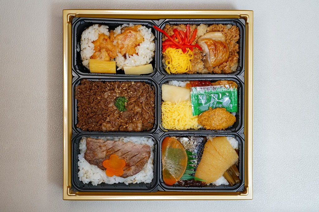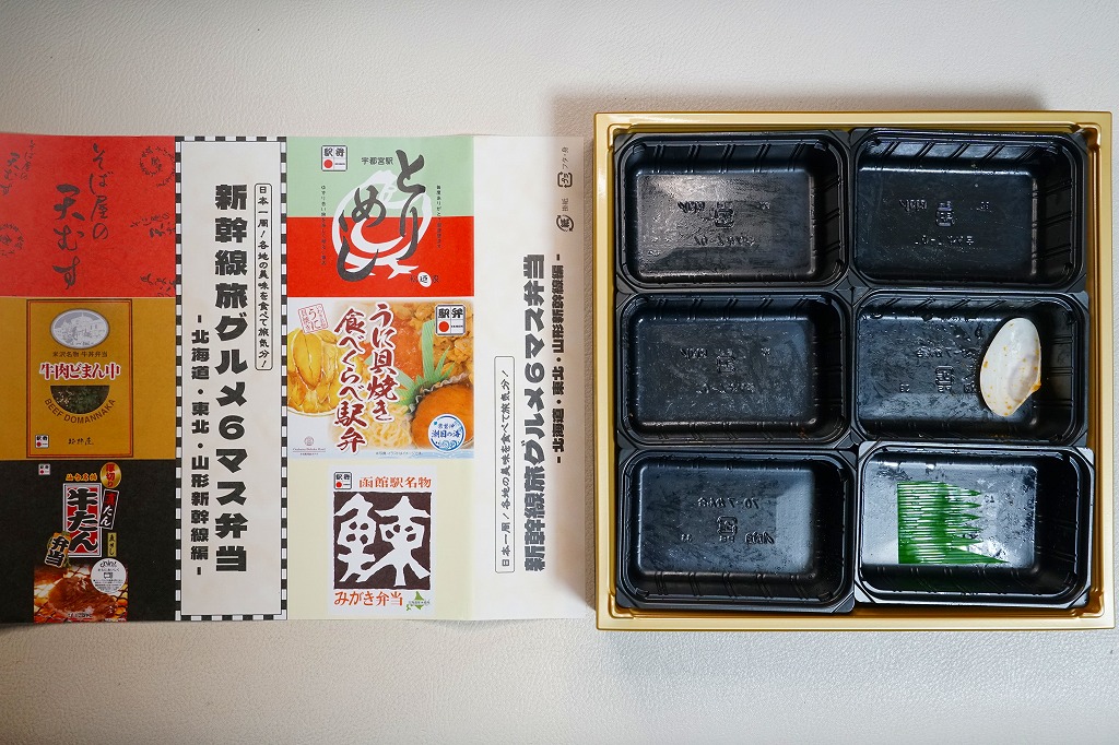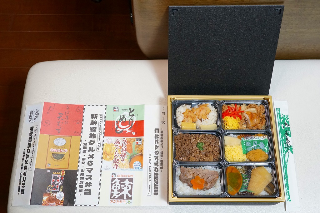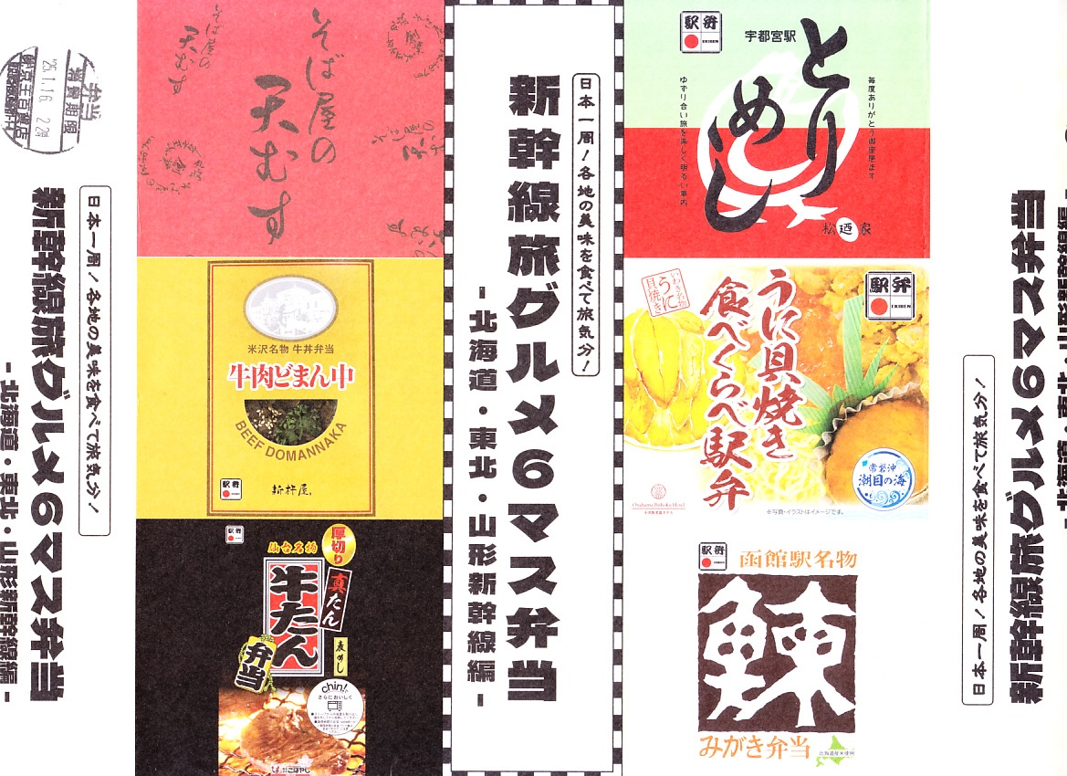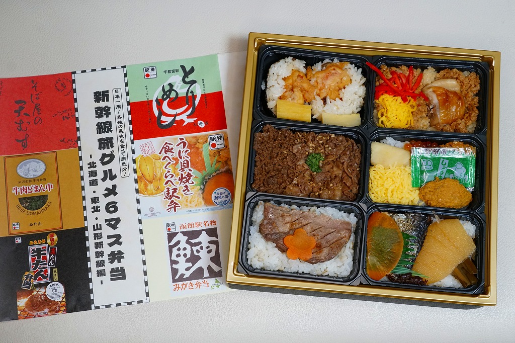 2025(令和7)年1月の京王百貨店の駅弁大会で販売。同大会の60回を記念し、新幹線の停車駅で販売している各地域の駅弁を6マスに詰めた弁当を実演販売した。これは東海道新幹線、上越・北陸新幹線、北海道・東北・山形新幹線、山陽・九州・西九州新幹線の4種類のうち「北海道・東北・山形新幹線編」で、東京駅「そば屋の天むす」、宇都宮駅「復刻とりめし」、米沢駅「牛肉どまん中」、福島駅「うに貝焼き食べくらべ駅弁」、仙台駅「厚切り真たん牛たん弁当」 、新函館北斗駅「鰊みがき弁当」の詰合せ。掛紙はその6種類の駅弁の絵柄の組合せで、大きな正方形の容器に6個のプラ製トレーを同じ大きさで詰め、それぞれの中身をミニサイズに収めた。ここでの筆頭は東京駅「そば屋の天むす」で、これを2個だけ詰めた。