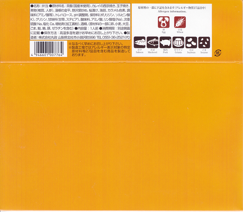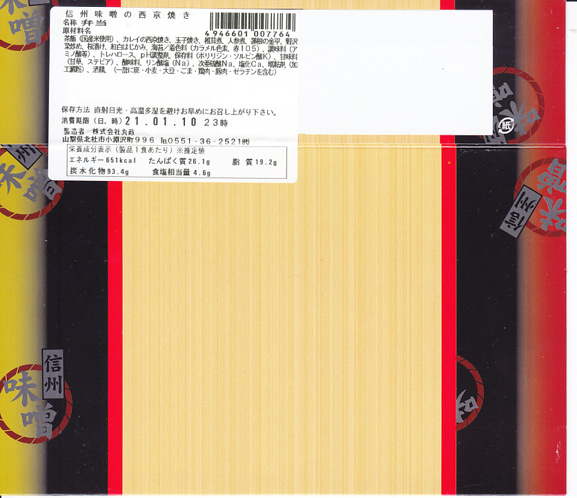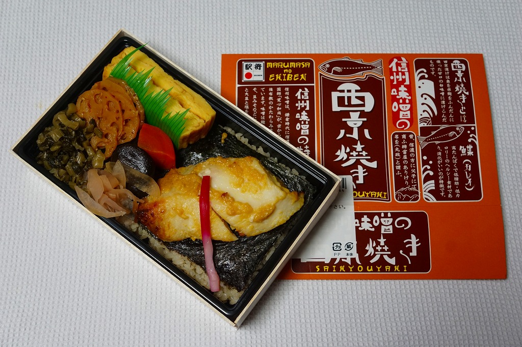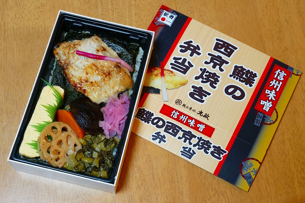 2018(平成30)年の夏に「信州味噌の西京焼き」の名前で発売か。2020年までにスリーブの絵柄を一新、容器や中身や値段を変えずに、名前が「信州味噌鰈(かれい)の西京焼き弁当」に変わった。中身は茶飯の半分を海苔とカレイ西京焼で覆い、残る半分を玉子焼、玉子焼、高菜、レンコンのきんぴら、ニンジンとシイタケの煮物、大根桜漬で覆う。味噌味の強さを感じさせない、あっさりとした白身魚。魚の小淵沢駅弁は、エンガワでないカレイの駅弁は、珍しいと思った。2024年までの販売か。