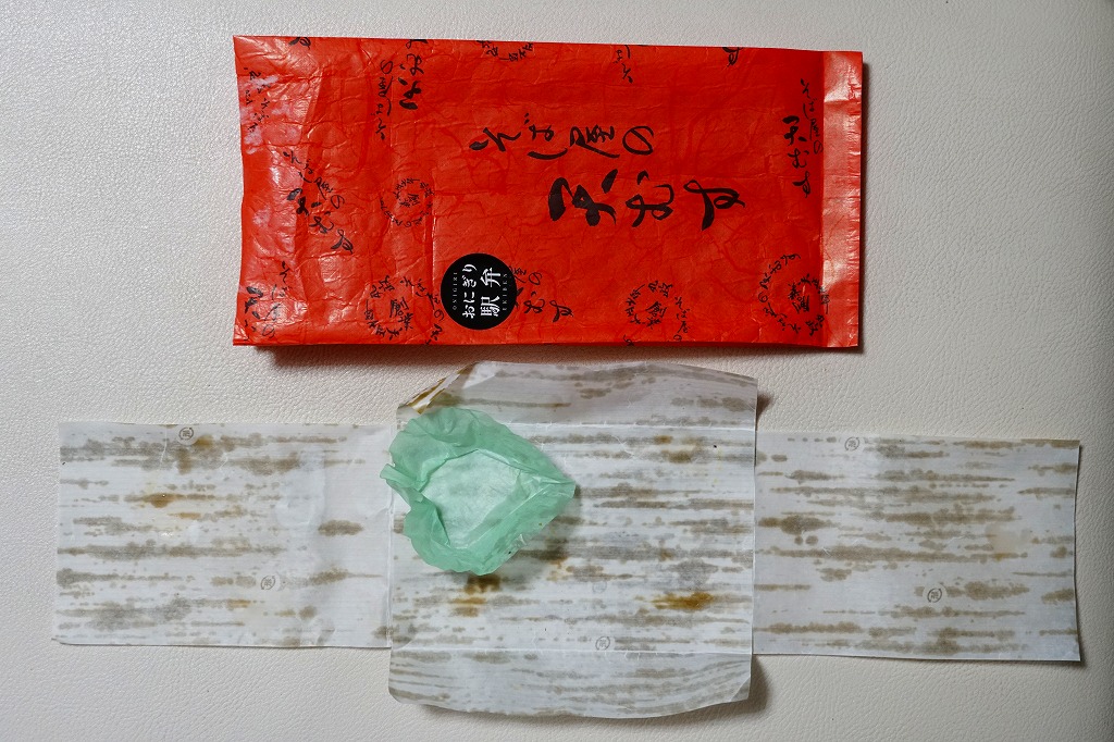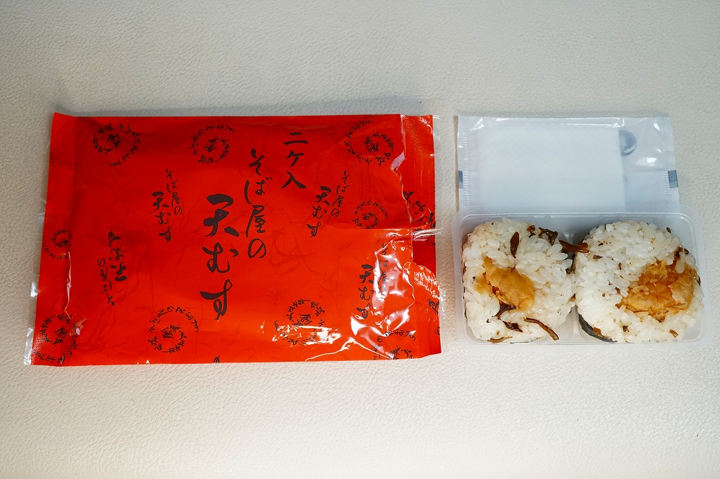 2023(令和5)年4月に東京駅で発見。小淵沢駅の駅弁「そば屋の天むす」の2個入り版。赤い絵柄はそのままに、プラ製になった小袋に、丸い天むすを2個、透明なプラ製トレーに収めて詰める。中身は5個入りと同じでも、中身が潰れないので、味が整うように思える。価格は2023年の発見時で360円、2024年時点で380円、2025年時点で400円。