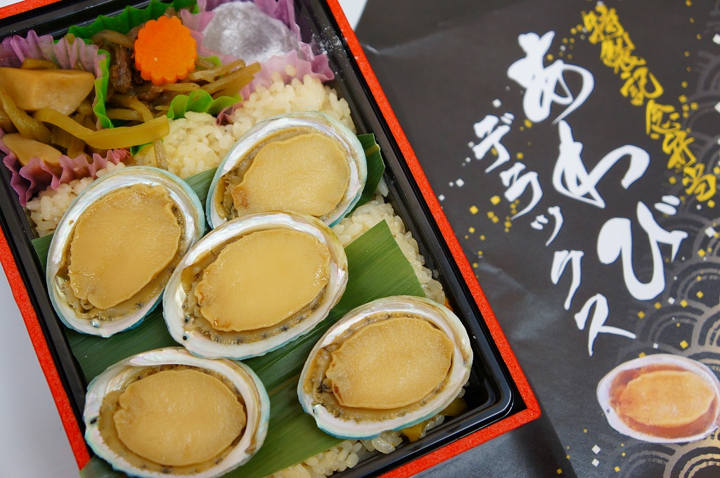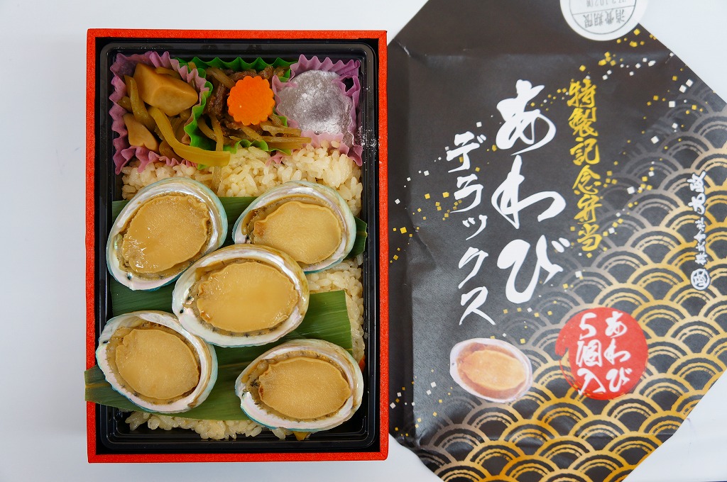 2013(平成25)年2月の鶴屋百貨店の駅弁大会で、いくつかの小淵沢駅弁とともに実演販売されたお弁当。長方形の容器に茶飯を敷き、小粒ながらきれいなアワビを5個も敷き列べ、煮物や大福などを添えるもの。なぜここでこういう商品を作ったのかはよく分からないが、第50回記念の駅弁大会のチラシと催事場に花を添えた。