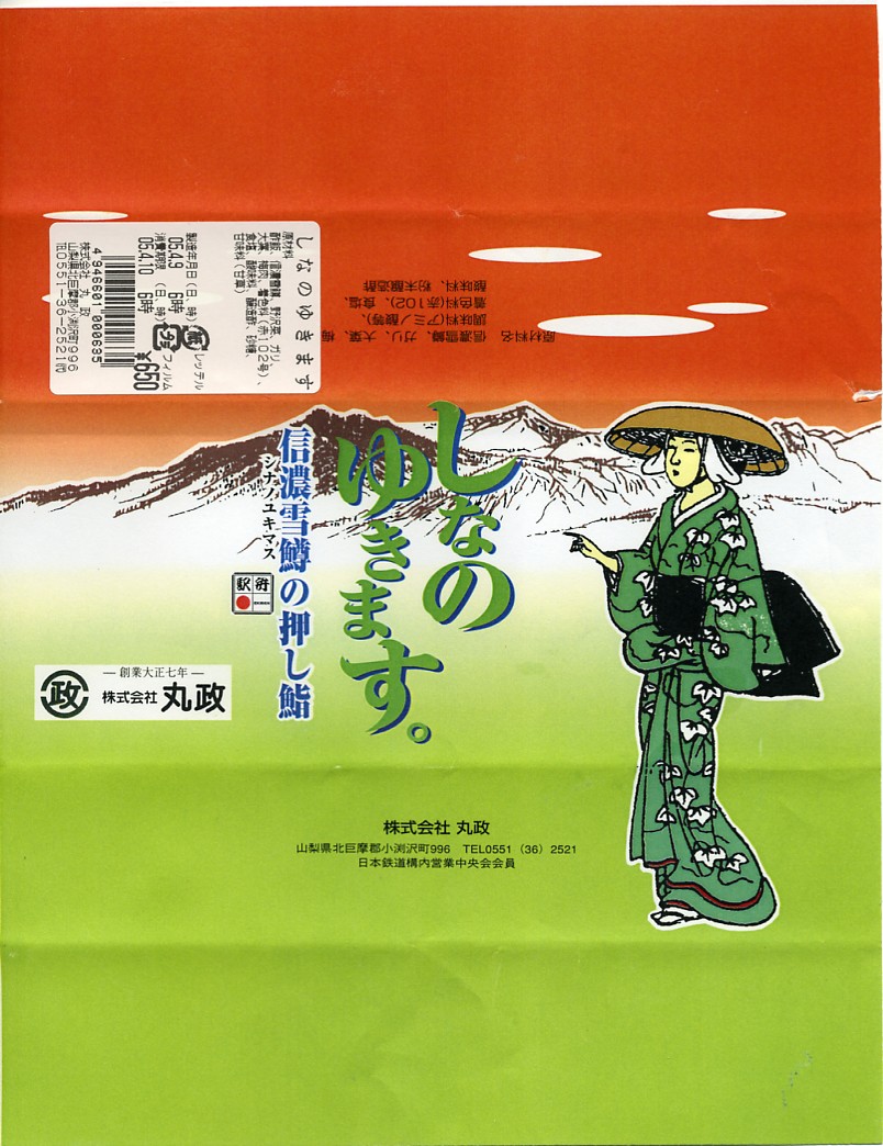シナノユキマスは、長野県が1975(昭和50)年に当時のチェコスロバキアから導入し、佐久の水産試験場で9年かけて養殖技術を確立した、東欧原産のサケ科の湖沼性淡水魚。1983(昭和58)年に当時の吉村午良長野県知事が命名したという。飼育が難しく佐久地方以外に広まらないためか、知名度がなかなか上がらない。それでも県境を越えて山梨県の駅弁屋が、こうして駅弁に使用した。