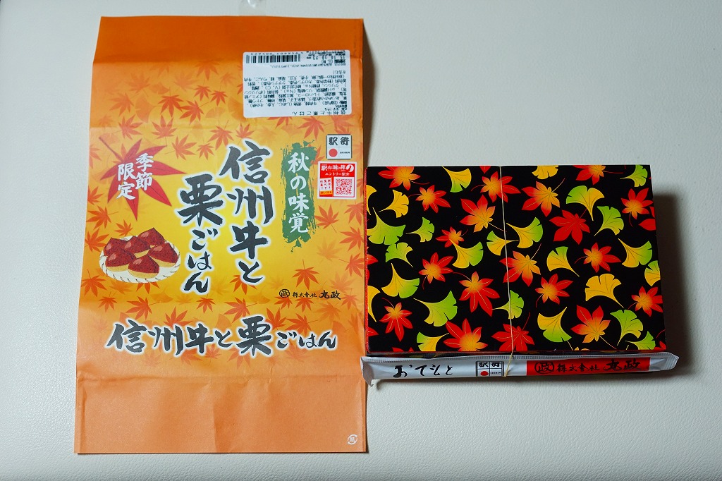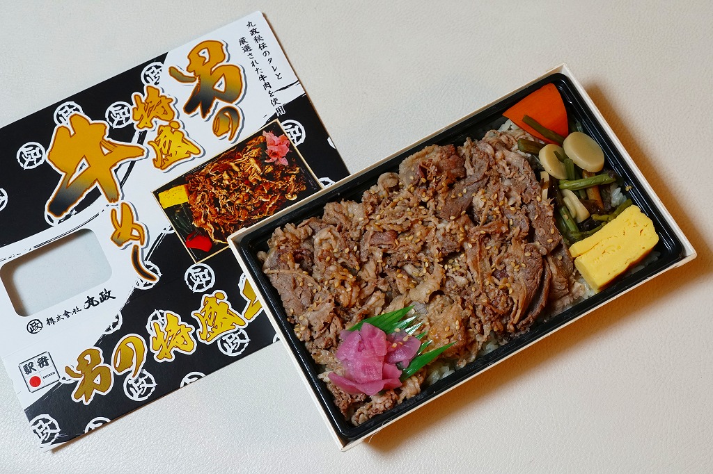 2014(平成26)年7月の発売。商品名は「小淵沢丸政の信州牛弁当」とも。木製風の折箱が、まるで贈答品のように包装紙でていねいに包まれる。中身は白御飯を牛焼肉で覆い、赤かぶ漬を添えるもの。長野県内や県外の生産者と加工業者と販売業者100者以上で構成する、信州牛生産販売協会のブランド牛「りんごで育った信州牛」の、枝肉格付け等級でA5とA4の肉を使用し、「完成まで七年かけた秘伝タレで丁寧に直火焼きで焼き上げ」たという牛肉は、脂身と赤身と焦げの香りと、肉の適度な柔らかさが印象的。東京駅で米沢駅弁に負けていない。価格は2014年の発売時で1,730円、2017年時点で1,980円。
