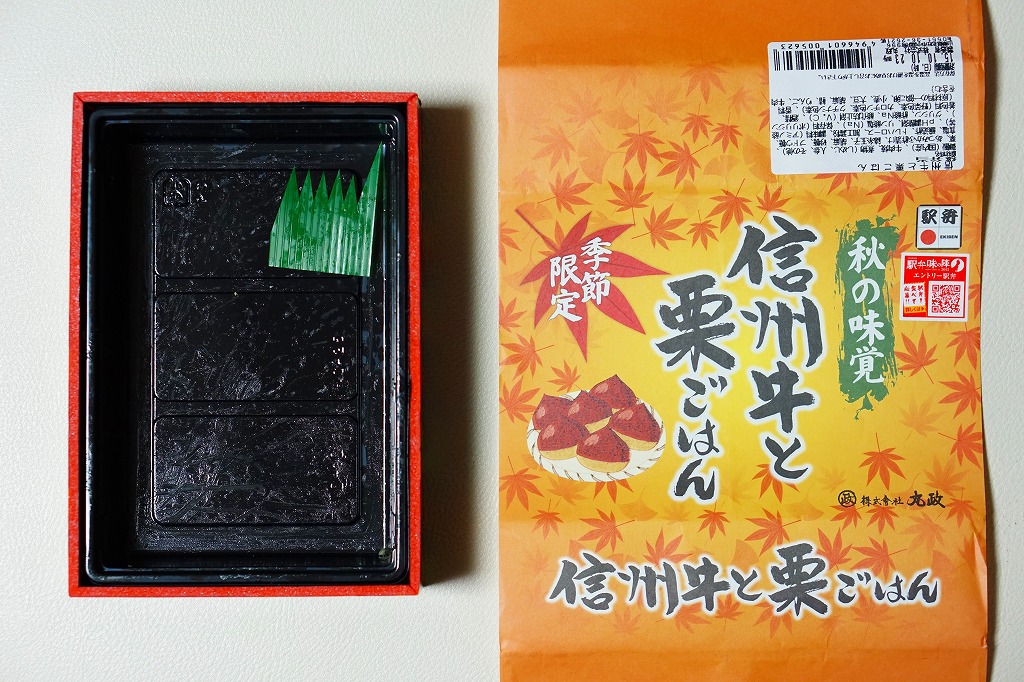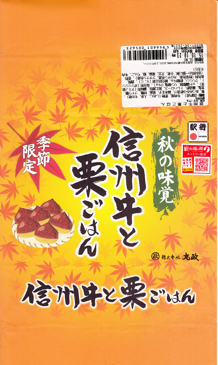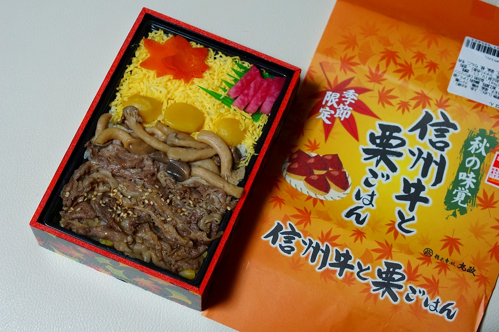 秋冬の駅弁大会シーズンに向けた、2014(平成26)年秋の新商品か。小淵沢駅や茅野駅の秋駅弁か。容器いっぱいに白御飯を敷き、錦糸卵と牛焼肉で半分弱ずつ、シメジとクリで残りを分けて覆い、カブ酢漬けとモミジ型のニンジン煮を添える。名前どおりの牛と栗。栗の甘味と牛肉の焼き肉感が、それほど多くない分量の割にしっかりと出ていた。2018年頃までの販売か。