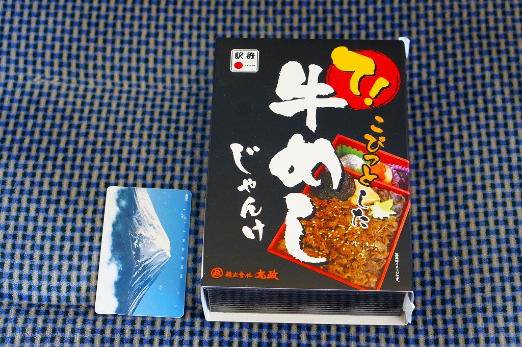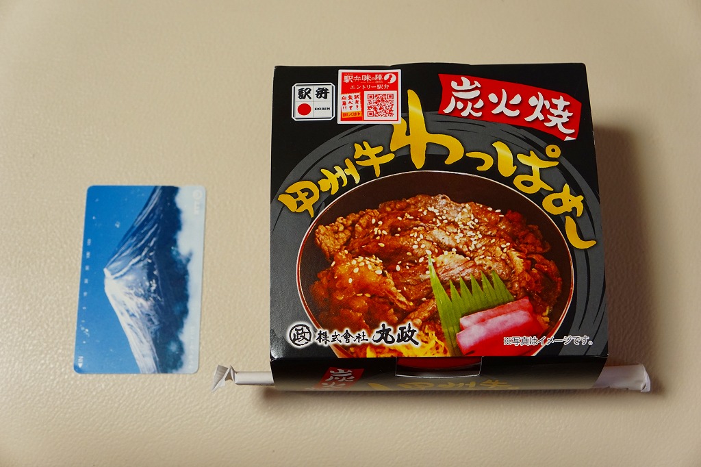 2014(平成26)年7月の発売。不思議な駅弁の名前は甲州弁のようで、「おっ!しっかりした牛めしじゃないか」の意か。中身は全国各地の牛肉駅弁と同じく、白飯を牛肉煮で覆うもの。山梨県産甲州ワインビーフを使い、白ごまを振り、シイタケ煮とタケノコ煮と糸こんにゃくを添え、巨峰寒天餅や漬物などを添える。佃煮や時雨煮のような硬めの牛肉はとても甘辛く、飯が進むとも思い、舌と胃に重すぎるなとも思い。1年間ほどの販売か。