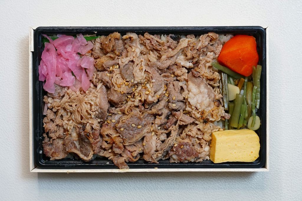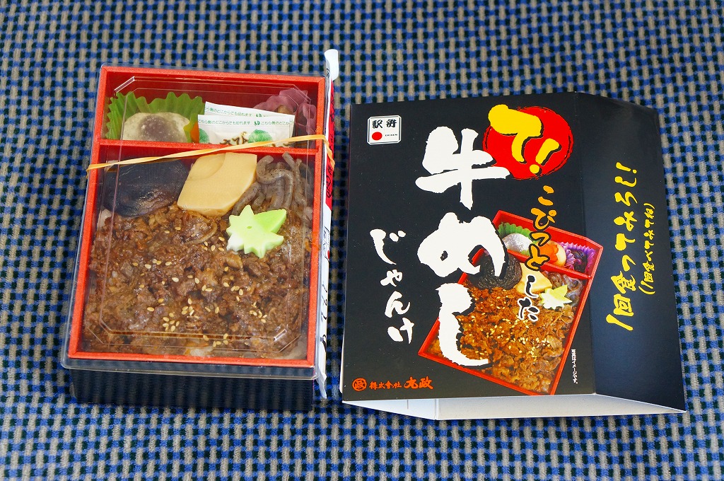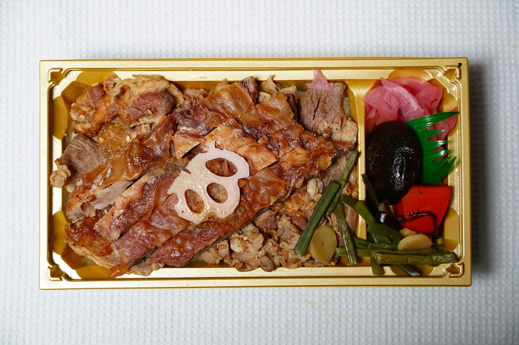 2018(平成30)年の秋に「大盛牛肉男の肉飯」の名前で、スーパーの駅弁大会などで発売か。白飯を牛焼肉で覆い、玉子焼、煮物、山菜、大根桜漬を添える、書けば普通の牛肉駅弁。駅弁の名前にあるとおり、たしかにパサついた見栄えとふわふわな食感の牛肉は多めで、この調製元の近年の牛肉駅弁と同じく、焼肉の香りが強烈。2020年の夏頃までの販売か。