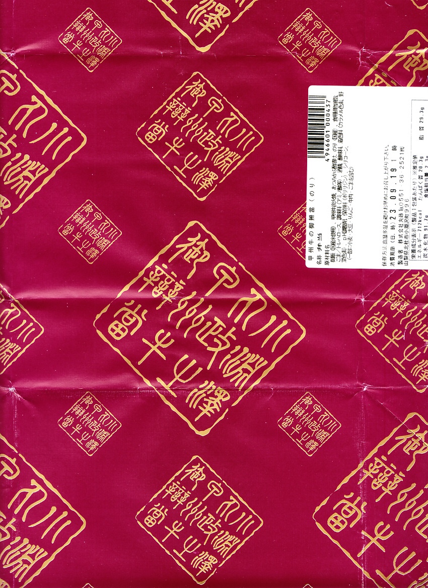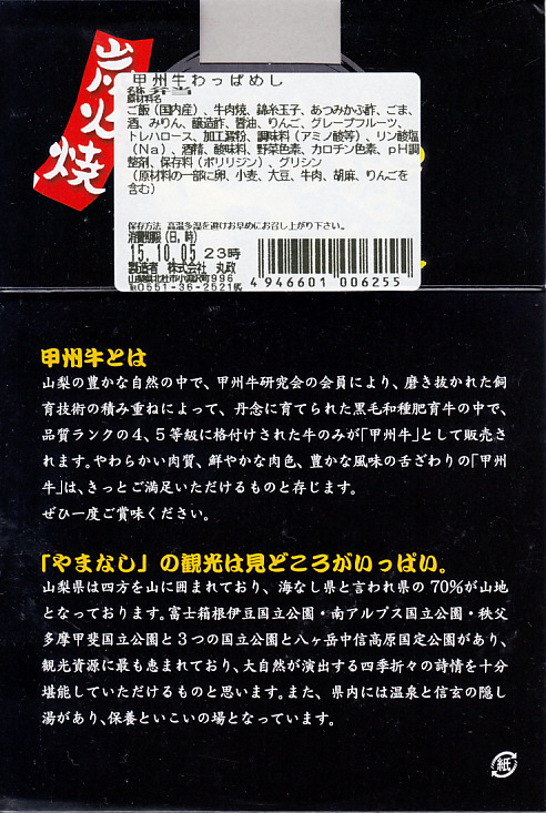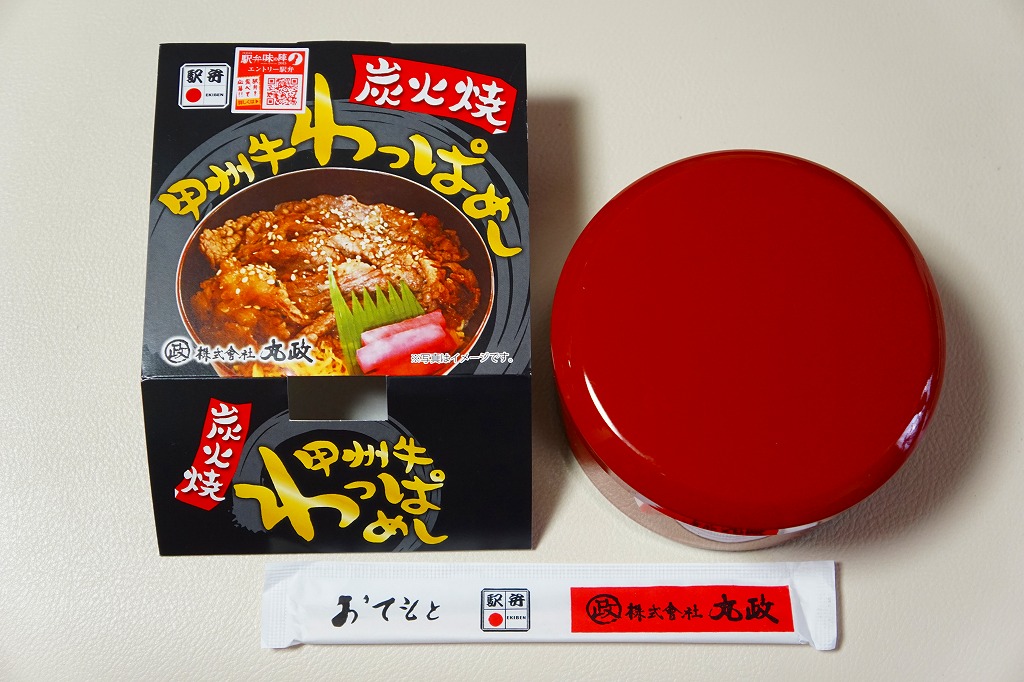 白御飯を海苔と牛焼肉で覆い、赤かぶ漬を添える、赤黒いプラ製トレーを収めた黒い長方形の容器を、印章の柄を持つ包装紙で包む姿は、下記の駅弁「小淵澤丸政之信州牛御辨當(小淵沢丸政の信州牛弁当)」とほぼ同じ。その信州牛が「甲州牛」に替わり、商品名と掛紙の印章に反映される。味はそれとまったく同じといってよく、脂身と赤身と焦げの香りと、肉の適度な柔らかさが印象的。価格もおそらく同額だろう。