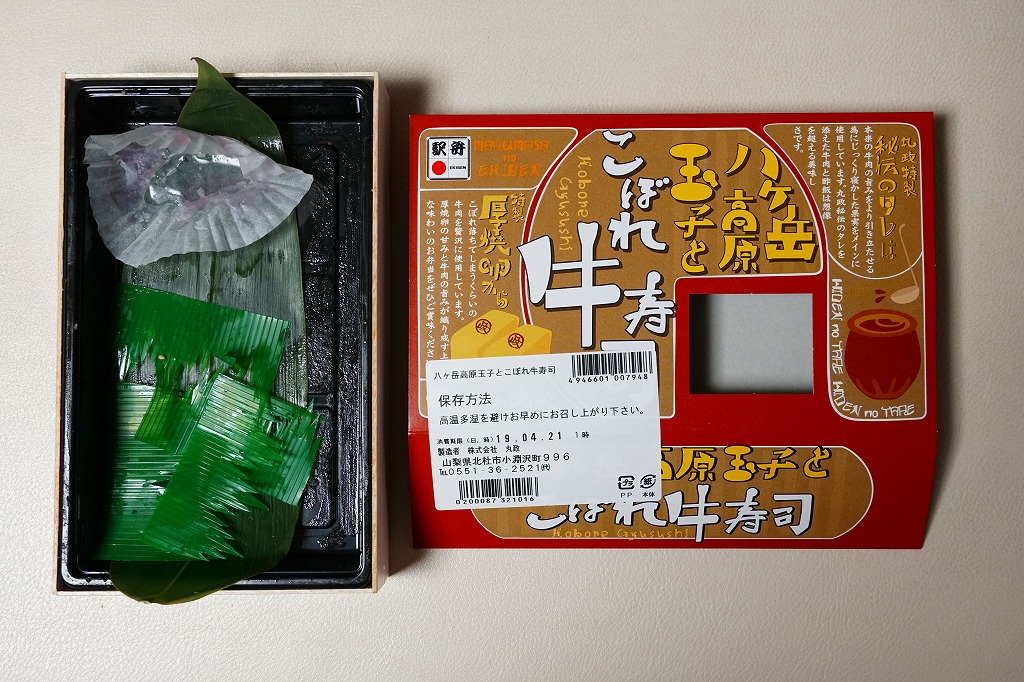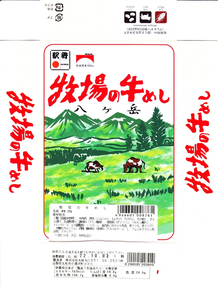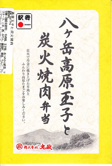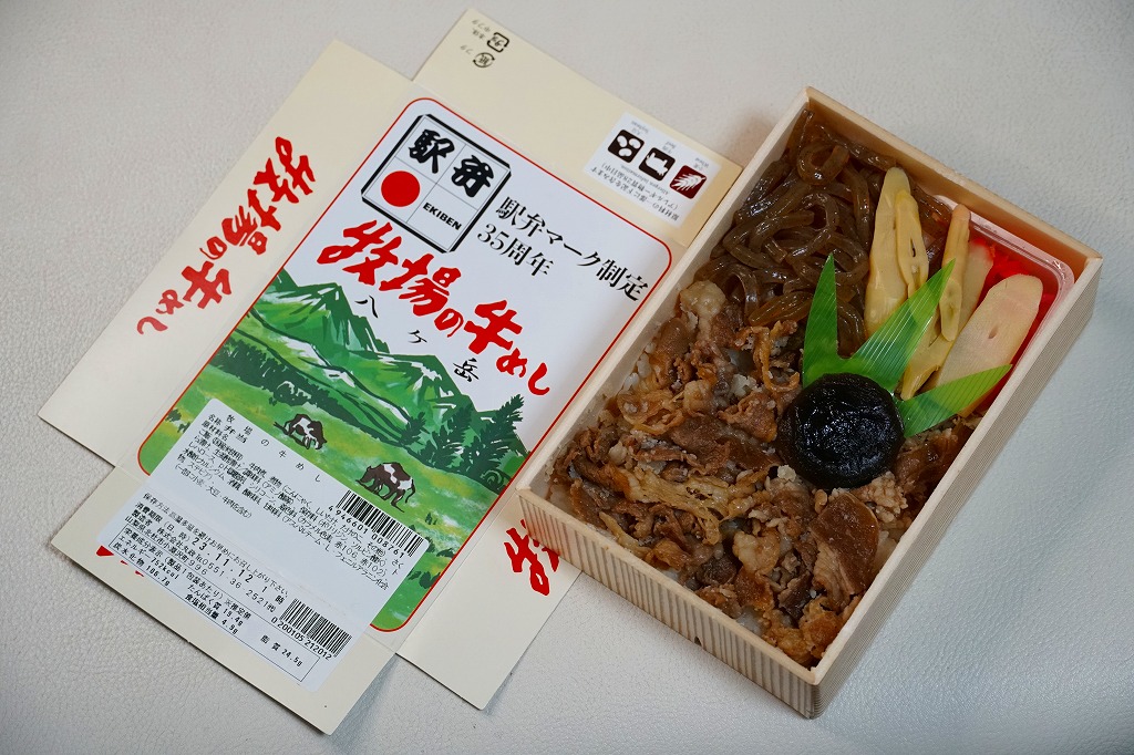 2022(令和4)年10月1日に、小淵沢駅と甲府駅と東京駅で発売か。同日からのJR東日本の駅弁キャンペーン「駅弁味の陣2022」にエントリー。20年前に販売していた駅弁の復刻版とされたが、もう少し古い1990年前後、30年以上前のものではないかと思う。ふたの絵柄は、八ヶ岳と牧場のイメージか。四角い容器に白飯を詰め、牛肉煮で覆い、こんにゃく、しいたけ、ひめたけ、紅生姜、大根桜漬、金印ねりわさびを添える。上等でなく並等の分量と品質と価格を持たせた、すき焼き風かもしれない牛丼弁当。