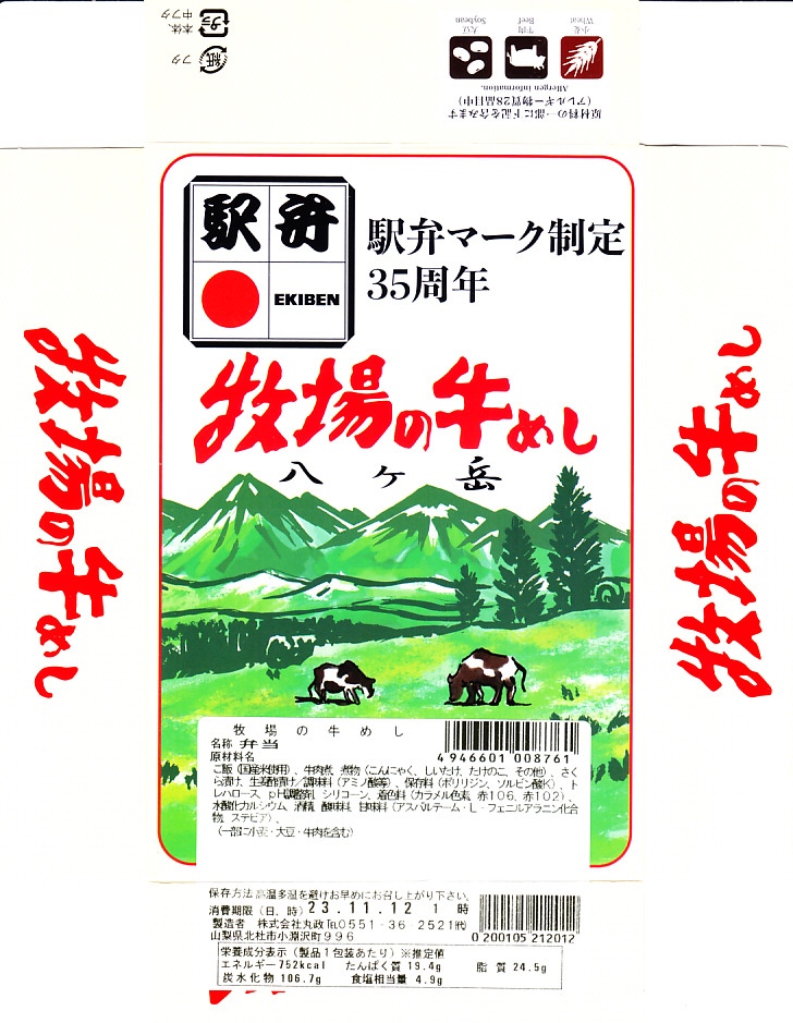 2023(令和5)年11月11日に購入した、小淵沢駅弁のふた。日本鉄道構内営業中央会の「駅弁マーク」制定35周年を記念し、会員のうち29社が主に11月10日から期間限定で販売した31種類の記念駅弁のうち、小淵沢駅のもの。上記の駅弁「牧場の牛めし」のふたに、大きな駅弁マークと「駅弁マーク制定35周年」の文字を載せた。容器や中身や価格は変わらない。これは11月10日から当分の間販売するという。