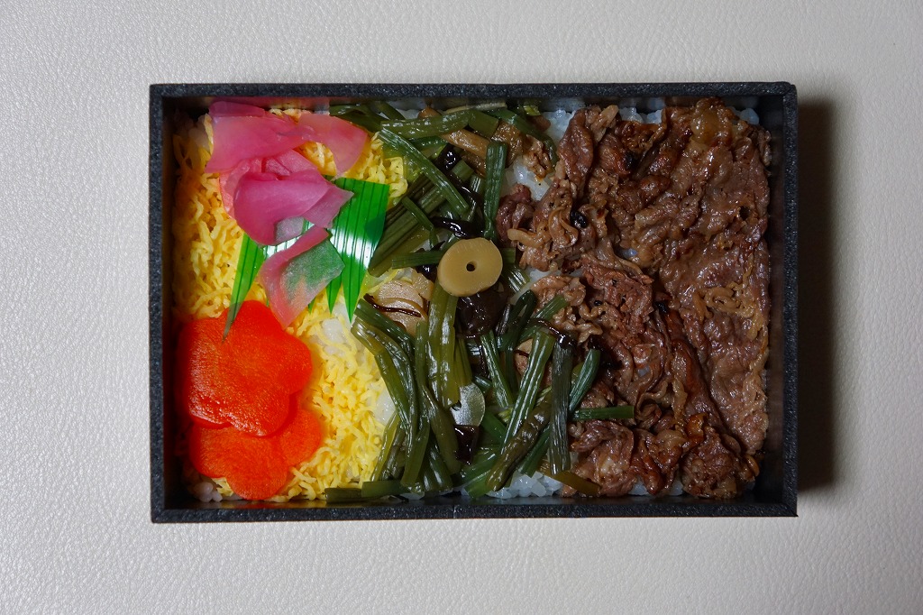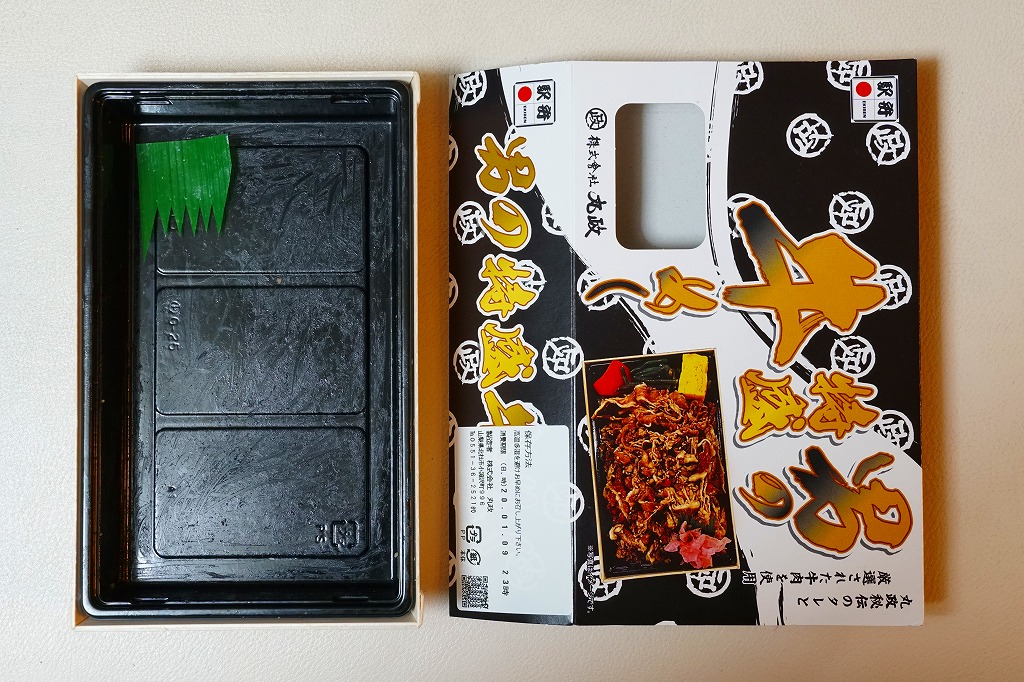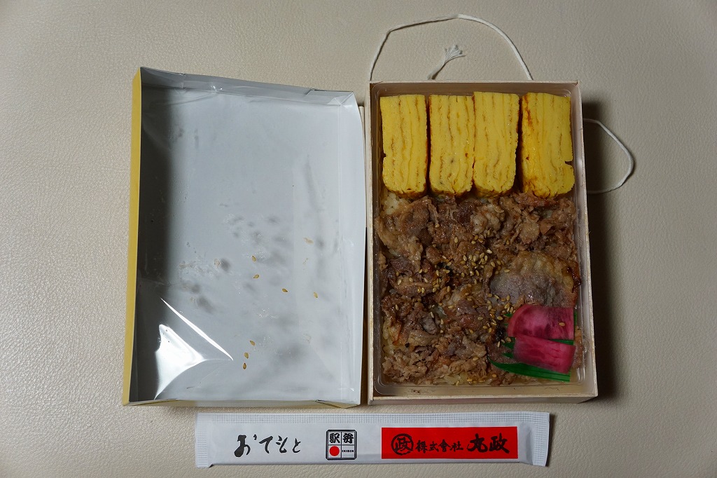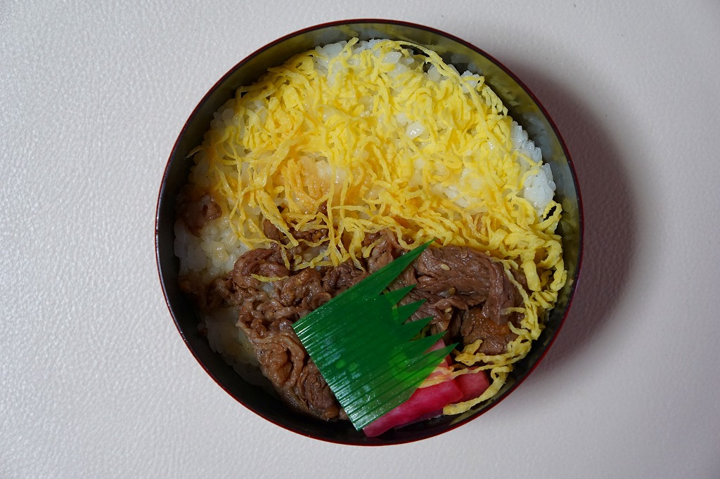 2019(平成31)年4月の発売か。酢飯に牛肉を載せて海苔で巻く軍艦巻3個と、大きな玉子焼に極小の酢飯を載せたもの2個を交互に並べ、小柄な長方形の容器のすき間を牛肉で埋める。御飯入りの駅弁なのにほとんど御飯が入っていない、個性的なレイアウト。高級なものとは思えない牛肉に、適度な厚みと噛み切りやすさと、常温でも強力な焼肉の香りを持たせているのは、最近のこの調製元の特徴だと思う。半年間ほどの販売か。