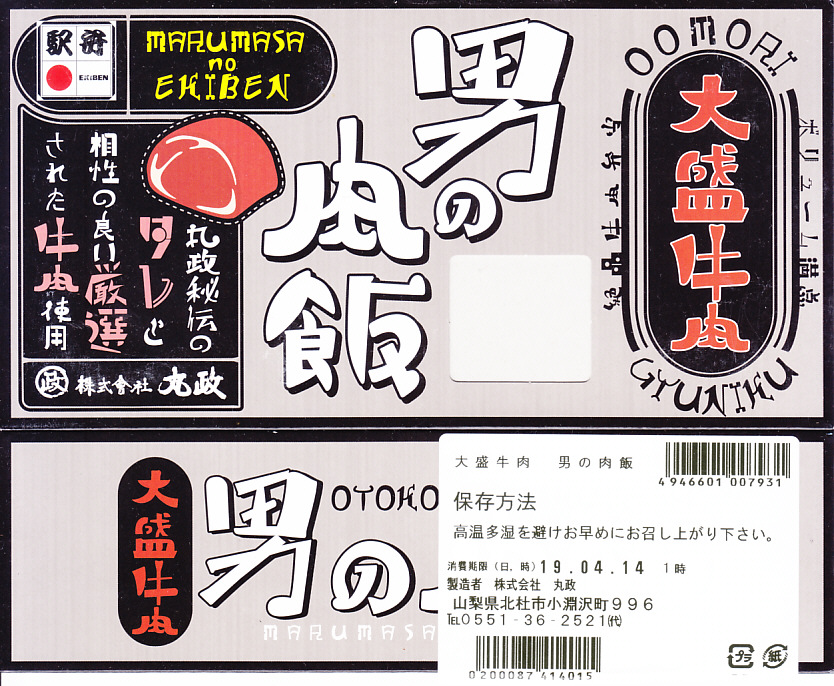 2019(平成31)年4月13日に購入した、小淵沢駅弁のスリーブ。上記の駅弁「男の特盛牛めし」と、名前や絵柄は異なるが、言いたいことはおおむね似ている。容器も当時はプラスティック素材のみでできていたが、中身や味や価格は変わらない。