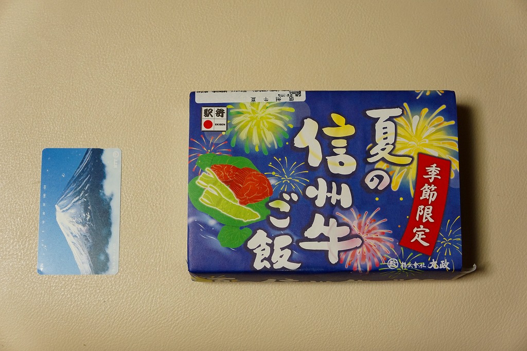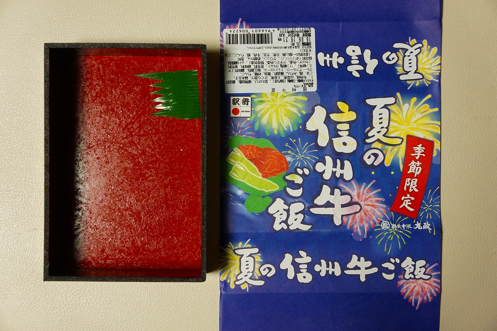2015(平成27)年夏の発売か。6月下旬頃から9月上旬頃までの販売か。名前のとおり、夏季限定の駅弁。掛紙に加えて容器にも、花火の模様が入っている。中身はワサビ飯の上を、錦糸卵と山菜煮と牛肉焼で覆い、ニンジンと大根桜漬を添えるもの。濃いめの色と味付けで、肉の旨味がおかずになったものの、大きな文字で「信州牛」を名乗るには、肉の分量が淋しいと思った。2020年までの販売か。