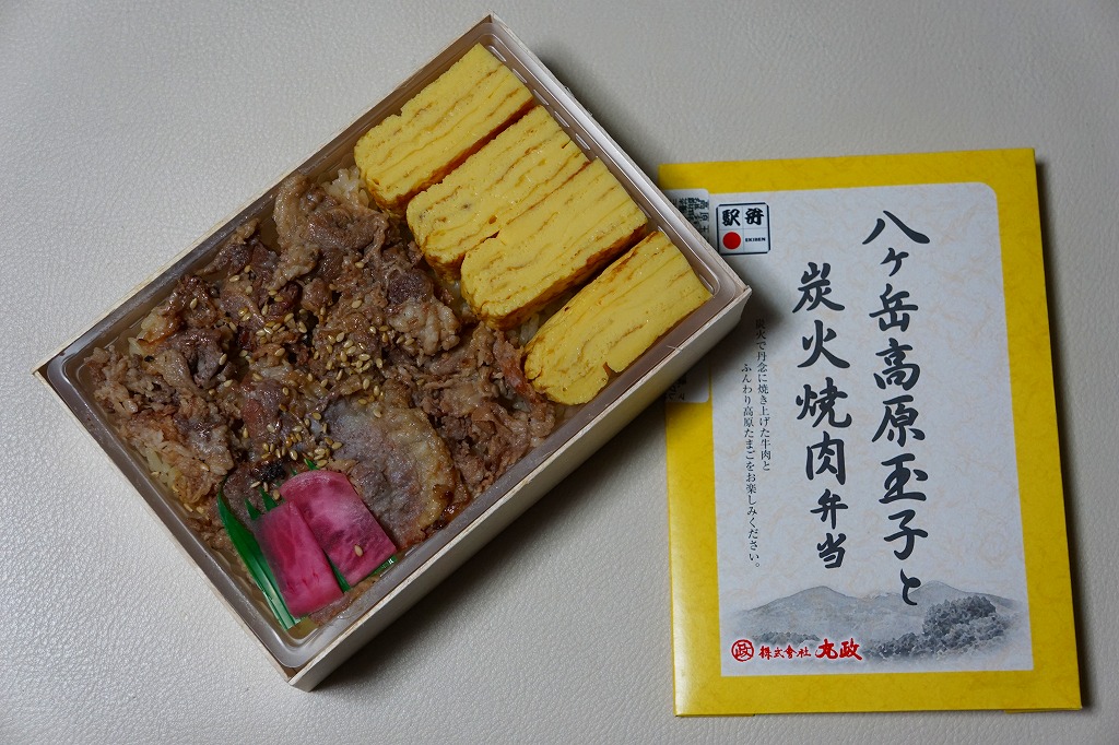 2016(平成28)年10月の発売。主に東京都内で売られる商品である模様。茶飯を牛焼肉と玉子焼で覆い、赤かぶ漬を添える、シンプルな駅弁。そんな牛丼か牛すき焼丼に見えて、小淵沢駅弁の他の牛焼肉丼と同じく、ちゃんと焼肉の味と香りがした。パッケージや中身の見栄えでなんとなく、東京で有名になった新潟駅弁「えび千両ちらし」を思い起こす。価格は2016年の発売時で1,050円、2020年時点で1,100円。