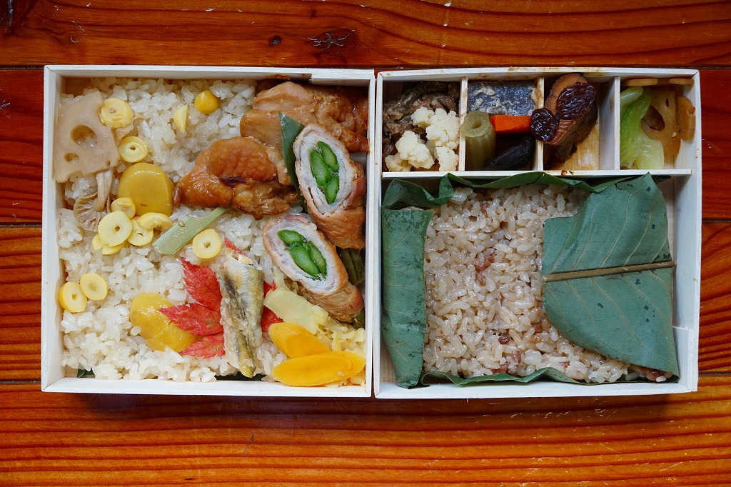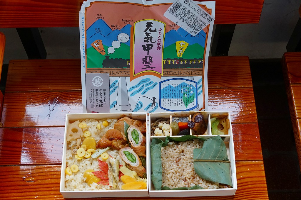 経木折の中身は、下段が東京の料亭「吉左右(きっそう)」の作品で、栗とシメジの混ぜ御飯にワカサギや鶏やアスパラの唐揚げ。上段は京都の料亭「菊乃井」の作品で、炊き込み御飯に香の物類が並ぶ。たちまち小淵沢の名物となった駅弁のこの姿は、発売当時から変わらない。調製元は発売当時の製作過程ビデオを用いて、品質を保つという。同時に復刻販売が始まった汽車土瓶も、価格を上げながら販売を続ける。