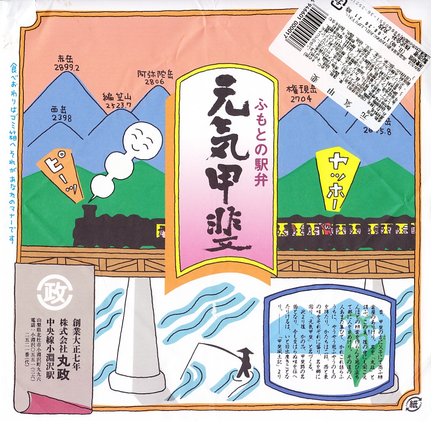 1997(平成9)年9月6日8時の調製と思われる、昔の小淵沢駅弁の掛紙。絵柄が発売時から現在まで変わらない、おそらく変えられない「元気甲斐」の掛紙。調製印がラベルになり、権現岳などの山の名前を隠してしまった。そこ以外に余白のない絵柄なので、食品表示は山の上になんとか収めた感じ。