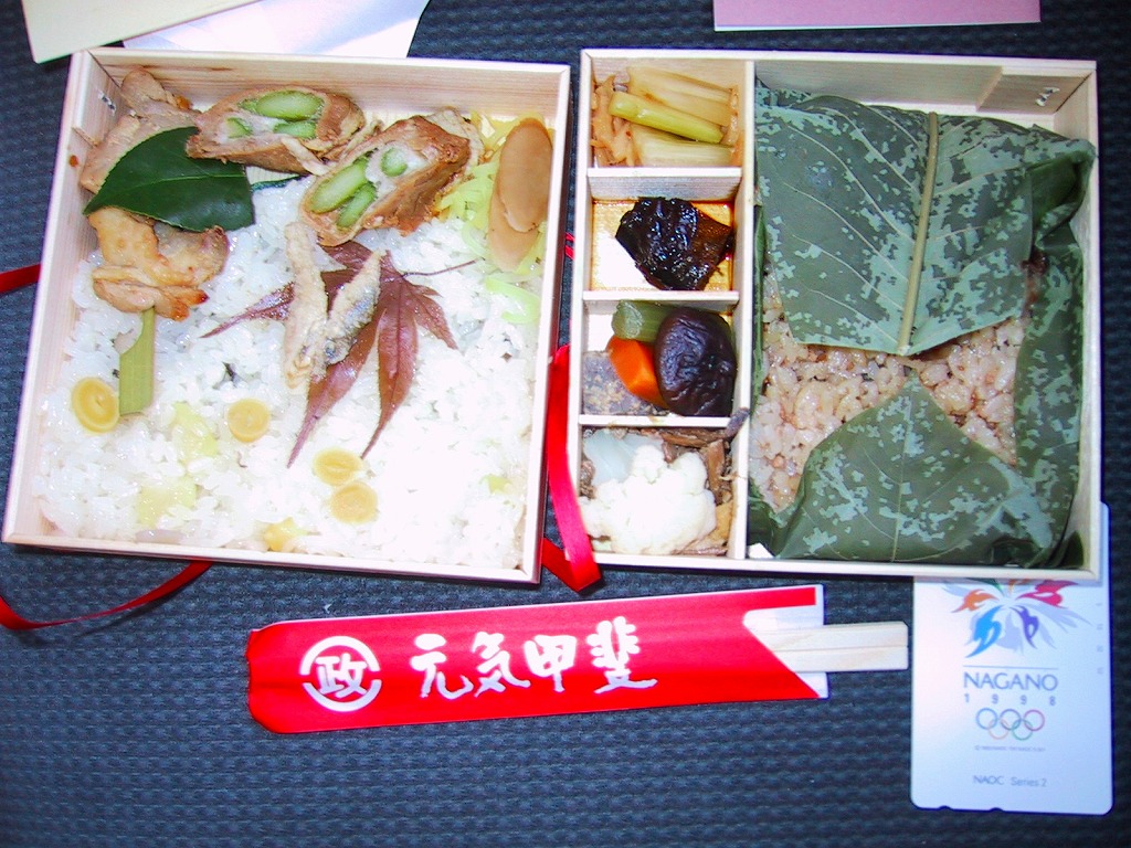 2001(平成13)年11月24日に購入した、小淵沢駅弁の掛紙。おそらくこの駅弁の誕生の経緯により、絵柄は発売時から現在まで同じである。調製元所在地、食品表示、その他法令上の標記が、時代により変わる。