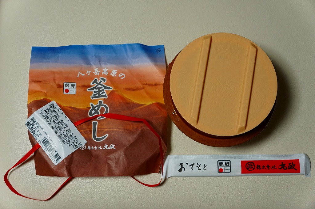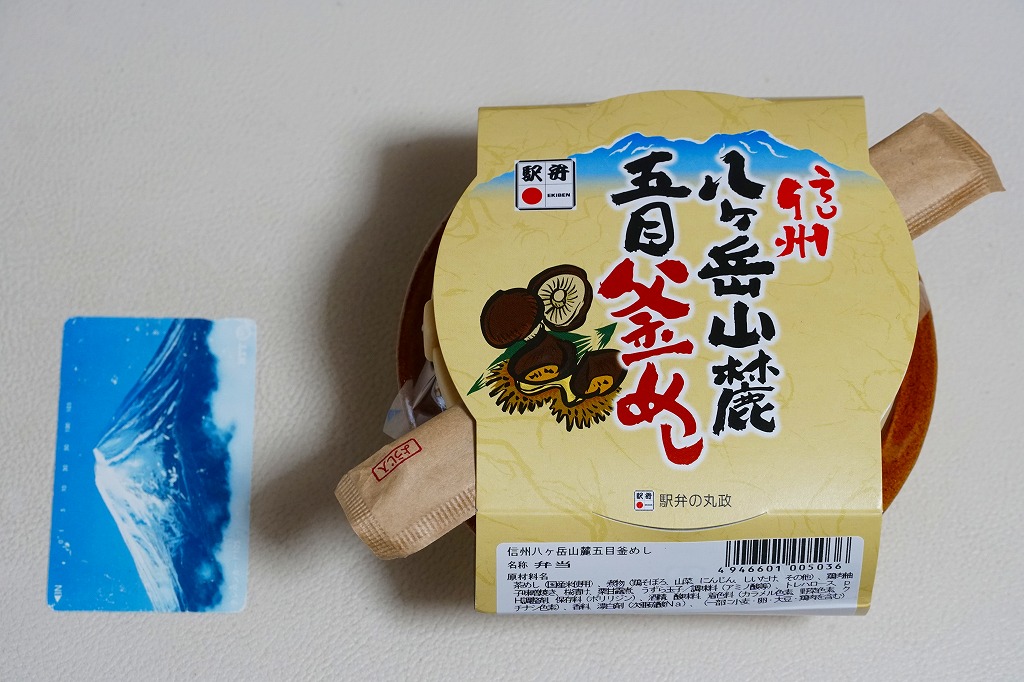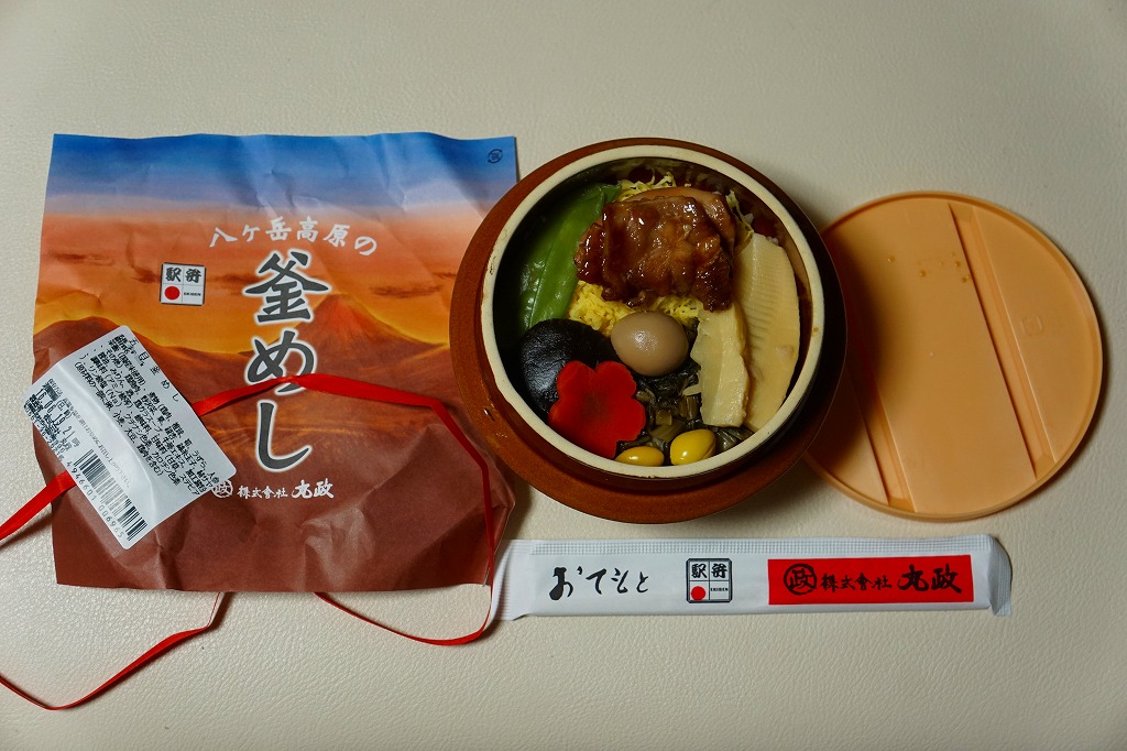 2016(平成28)年2月の鶴屋百貨店の駅弁大会でデビューか。陶製の本体にプラ製のふたをする釜型容器に、山の風景を描いた掛紙をかける。中身は茶飯を錦糸卵と野沢菜で覆い、鶏肉、タケノコ、シイタケ、きぬさや、うずらの卵、ギンナン、ニンジンで覆うもの。このページにたくさん掲載している、小淵沢駅の釜飯駅弁と同じタイプ。小淵沢駅弁を小淵沢駅以外の場所で見る機会は多いが、外国人観光客で賑わう富士急行の河口湖駅で見るとは思わなかった。これは「五目」で、他に「牛」があったらしい。2017年までの販売か。