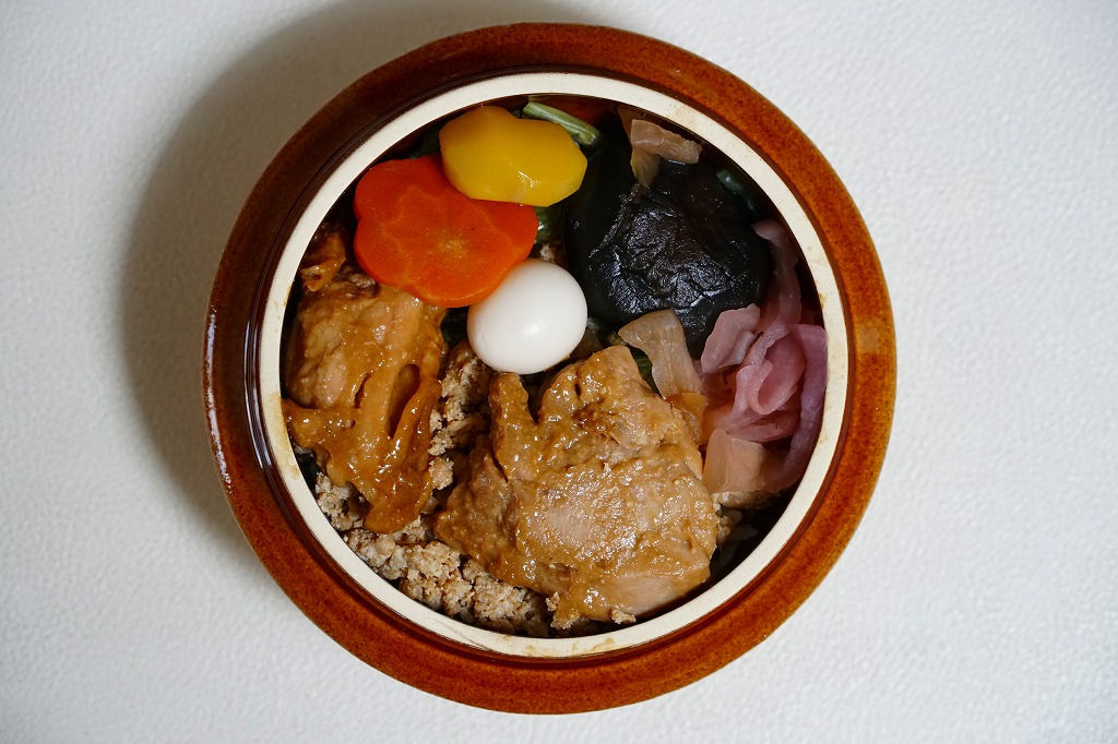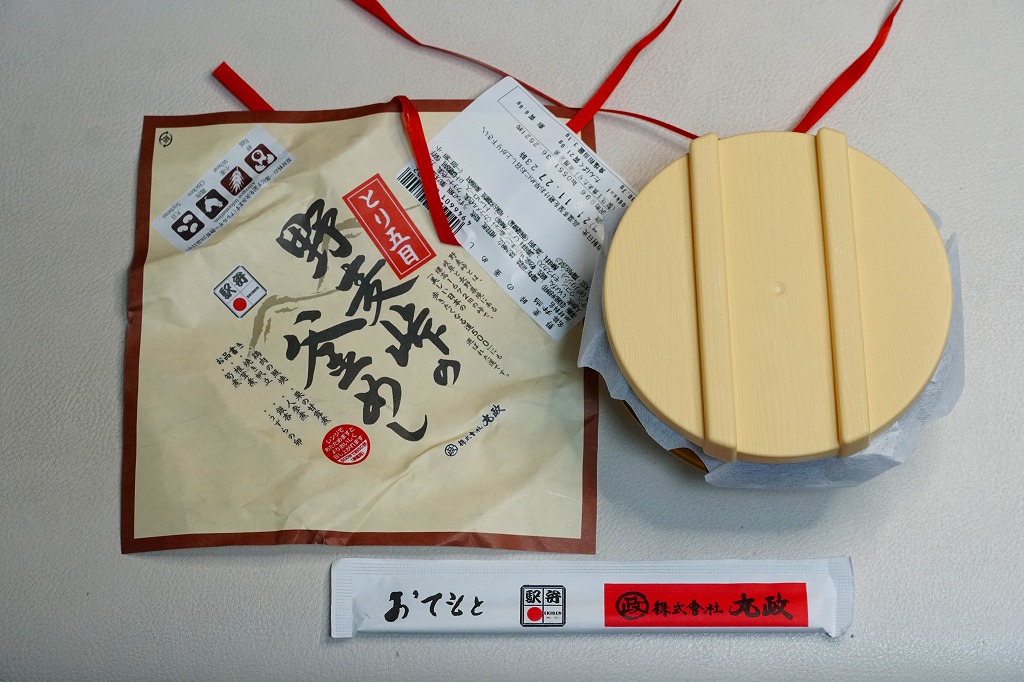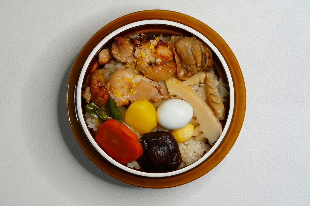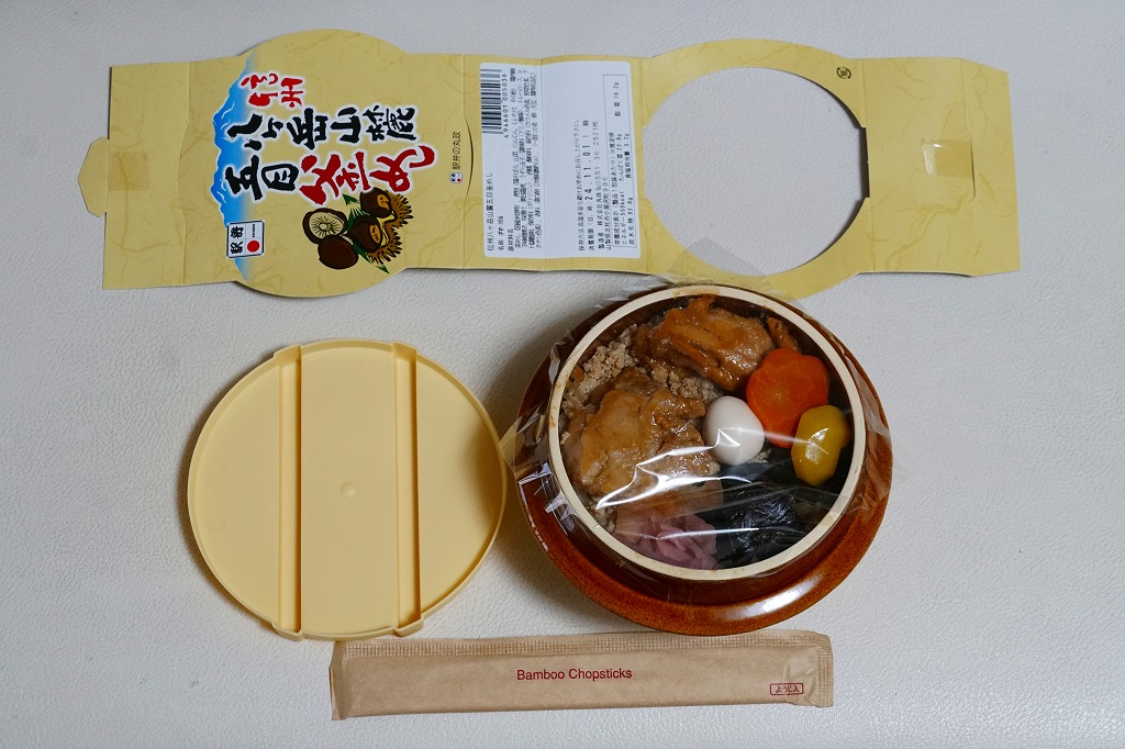 秋冬の駅弁大会シーズンに向けて、2020(令和2)年の9月に発売か。焼き物の釜飯向け容器にプラ製のふたをして、商品名を描いた正方形の掛紙をかけ、ひもで十字にしばる姿は、横川駅の名物駅弁「峠の釜めし」に似る。中身は茶飯を鶏肉、ホタテ、シイタケとタケノコとニンジンの煮物、いんげん、ぎんなん、うずらの卵などで覆うもので、やはり「峠の釜めし」とかなり似る。そう思うと、駅弁の名前にも「峠の釜めし」を含んでいる。1960年代以降、北海道から九州まで各地に出現した横川駅弁の類似品の中で、現時点ではこれが最も似ていると思う。味や雰囲気も、それに近い。漬物の別添がないのは、大きな差だと思う。