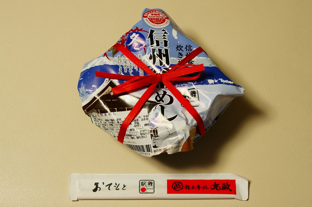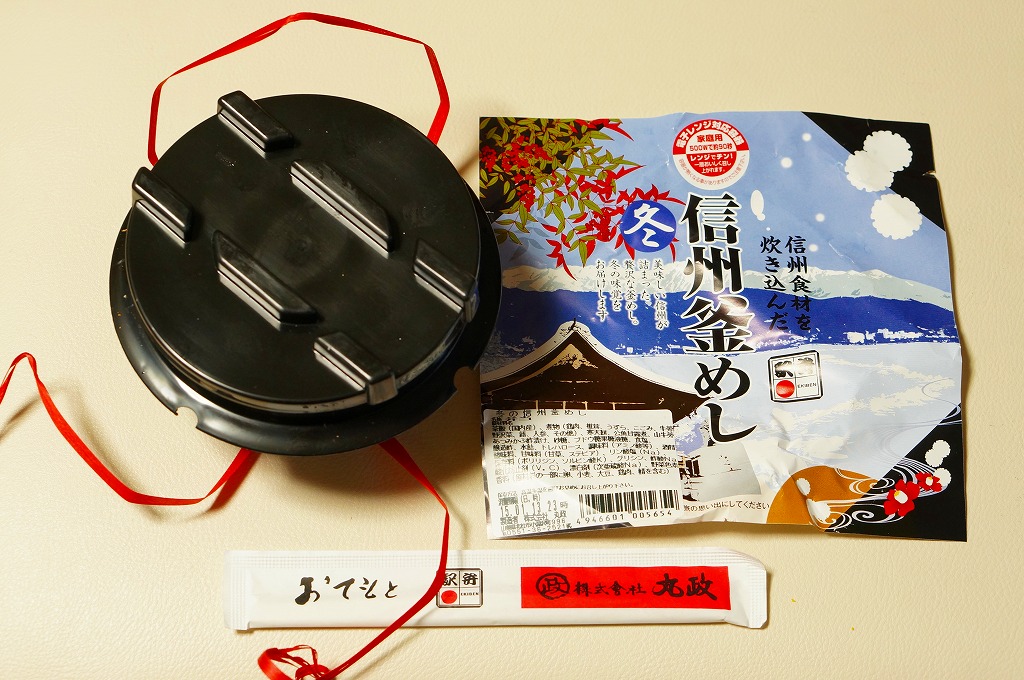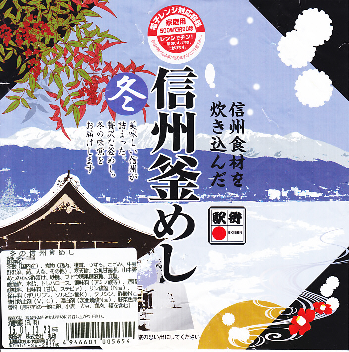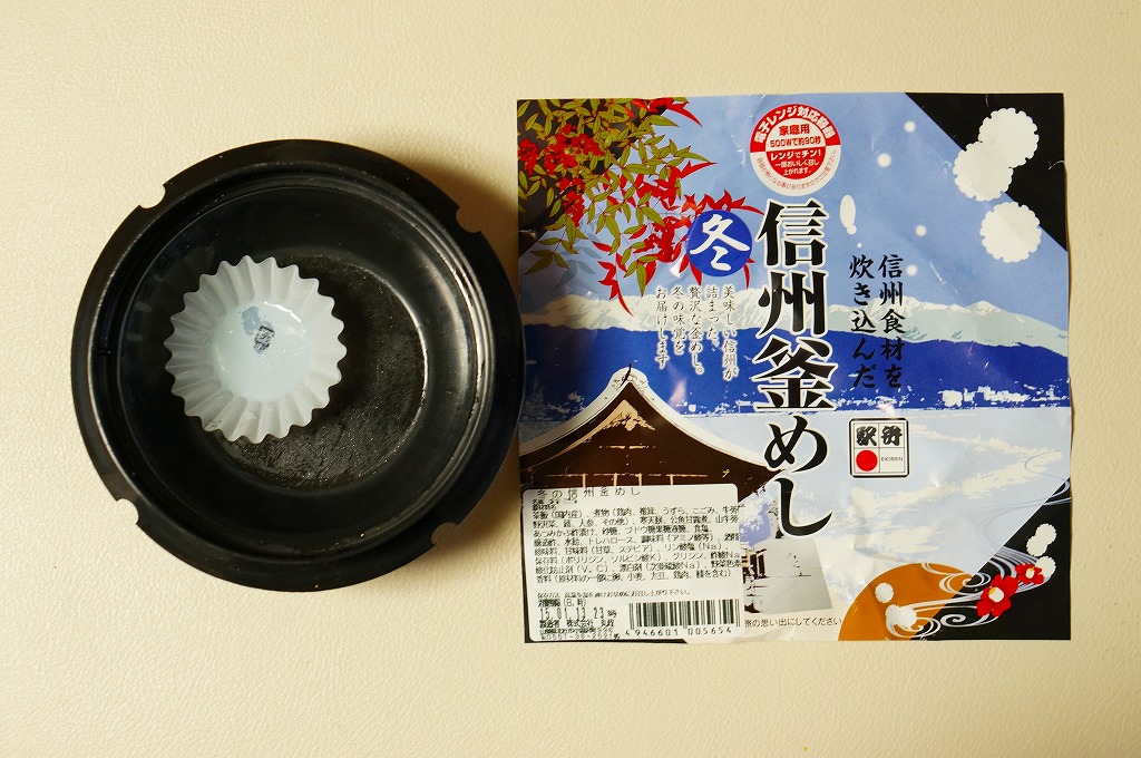 この小淵沢駅弁あるいは茅野駅弁の季節の釜飯は、2014(平成26)年度あるいは同年秋の発売だろうか。電子レンジ対応と思われる真っ黒なプラ製の釜に茶飯を詰め、鶏肉やシイタケやうずら卵などの煮物、ワカサギ甘露煮、野沢菜、寒天餅などで覆う。釜飯駅弁として、しっかりしたつくりになっていると思うが、このページにある様々な釜飯と同じく、この商品の主戦場は駅弁催事であると考えられる。現地で買って食べたという話は、ほとんど見られない。これは「冬」版で、他に「秋」と「春」があったらしい。2018年の「春」版をもって、同年の4月頃に終売か。