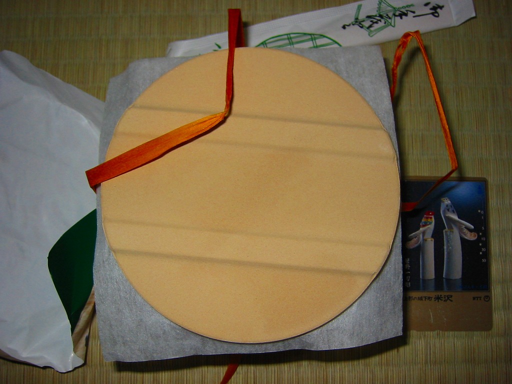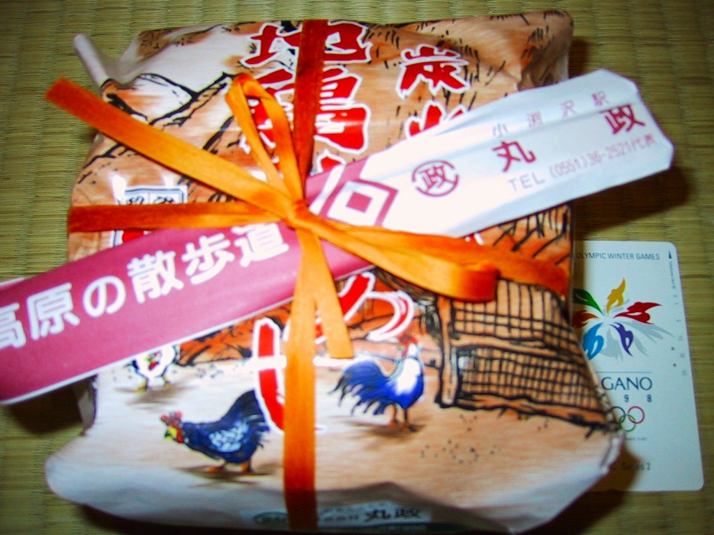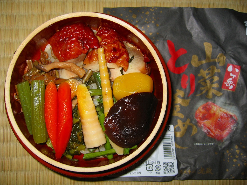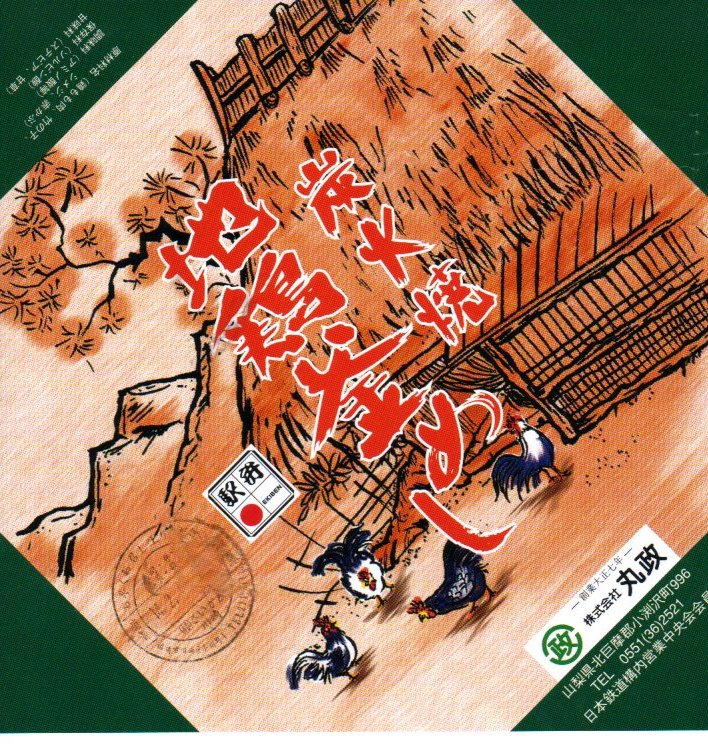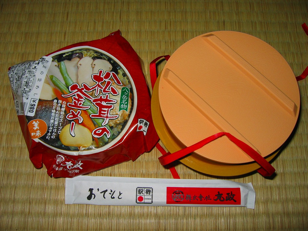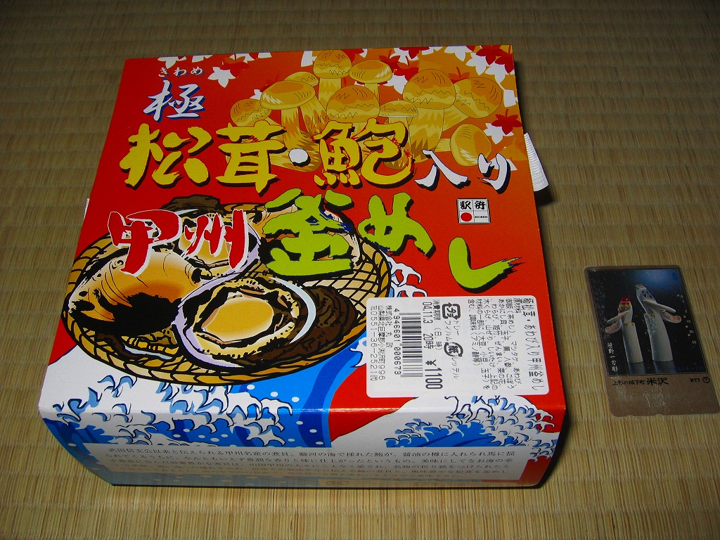 秋冬の駅弁大会シーズンに向けた、2005(平成17)年の秋の新商品か。焼き物の釜飯向け容器に陶製のふたをして、商品名を描いた正方形の掛紙をかけて、ひもで十字にしばる。中身は茶飯の上を鶏肉やごぼうや椎茸や山菜や栗や舞茸などで覆うもので、標準的な釜飯駅弁。色彩のくすみ、あるいは落ち着きは、小淵沢駅の釜飯駅弁の特徴だと思う。風味も同様。