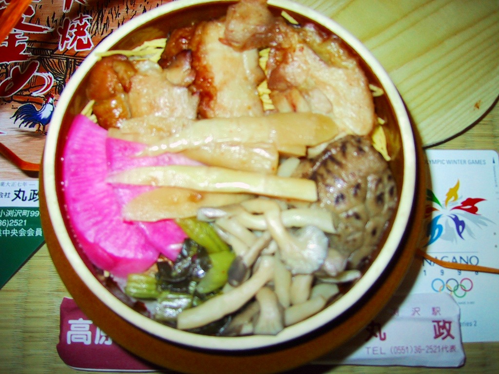 秋冬の駅弁大会シーズンに向けた、2007(平成19)年の秋の新商品か。加熱機能付き駅弁を思わせる、弁当向けには大きなボール紙の箱の中に、柔らかいプラ製の釜型容器がひとつ収まる。中身は紙箱の写真のとおり、御飯の上に山菜などを敷いたうえでフジザクラポークの豚ひき肉、豚角煮、豚焼肉で覆うもの。