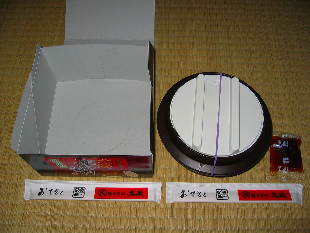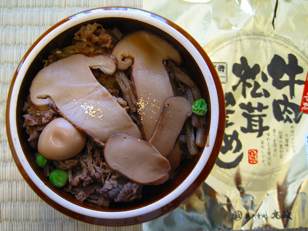 秋冬の駅弁大会シーズンに向けた、2009(平成21)年秋の新商品か。調製元の公式サイトによると、1985(昭和60)年発売の秋季限定駅弁だそうな。焼き物の釜飯向け容器にプラ製のふたをして、金色の掛紙をかけて、赤いひもで十字にしばる。中身は白御飯の上を牛肉煮で覆い、グリーンピースを散らしてゴボウ煮を添えて、さらにマツタケ煮で覆ってウズラの卵を置き、その上に金粉を撒くもの。