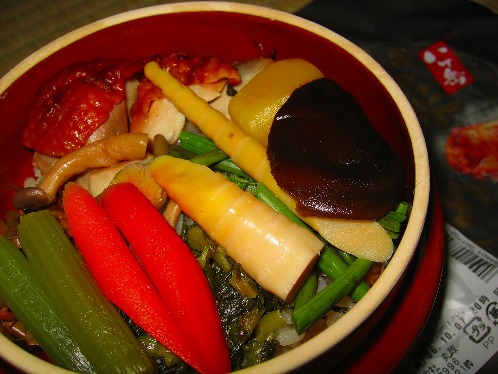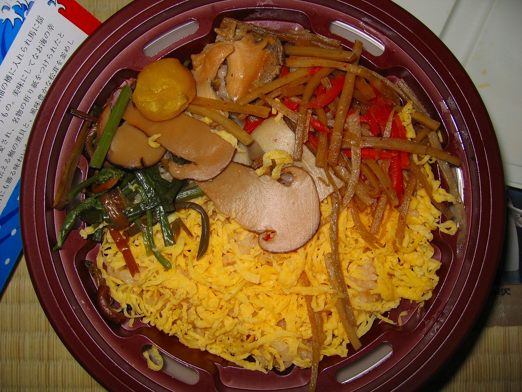 秋冬の駅弁大会シーズンに向けた、2004(平成16)年の秋の新商品か。円形の加熱機能付き容器を、賑やかな柄のボール紙にはめる。中身は茶飯の上に錦糸卵を敷き、松茸や山菜やきんぴらやアワビを載せるもの。