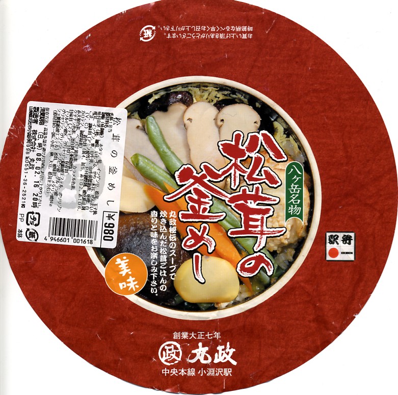 秋冬の駅弁大会シーズンに向けた、2007(平成19)年の秋の新商品か。焼き物の釜飯向け容器にプラ製のふたをして、中身の写真に商品名を上書きする真ん丸の掛紙をかけて、ひもで十字にしばる。中身は茶飯の上をホタテ、椎茸、松茸、タケノコ、栗、インゲン、山菜、錦糸卵などで覆ったもの。調製元の公式サイトでは秋季限定発売をうたうが、2月の購入日はどう考えても秋ではない。現地に実態がない、駅弁催事専用商品かもしれない。現存しない模様。