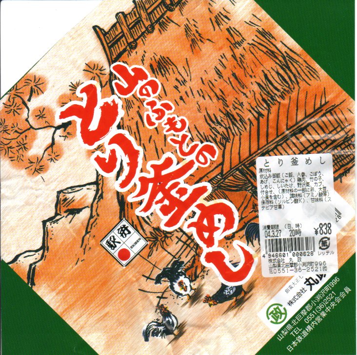 2004(平成16)年1月に発売か。焼き物の釜飯向け容器に陶製のふたをして、商品名を描いた正方形の掛紙をかけて、ひもで十字にしばる。中身は炊込御飯を錦糸卵、鶏肉、竹の子、椎茸、しめじ、姫竹などで覆うもので、釜飯駅弁の正統。同じシーズンに併売の「山菜鶏釜めし」と、とてもよく似ているので、小淵沢駅の釜飯駅弁は駅弁催事での需要が旺盛なのだろうと思う。駅弁大会対応商品。2004年のみの販売か。