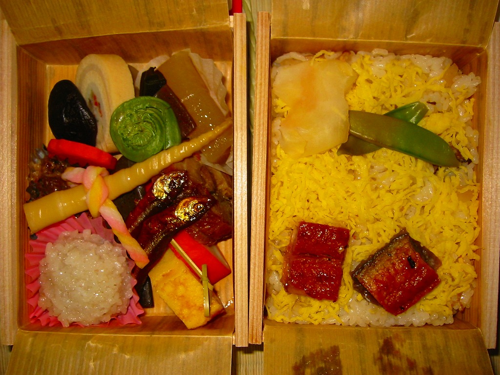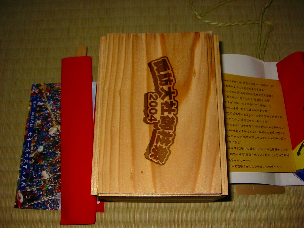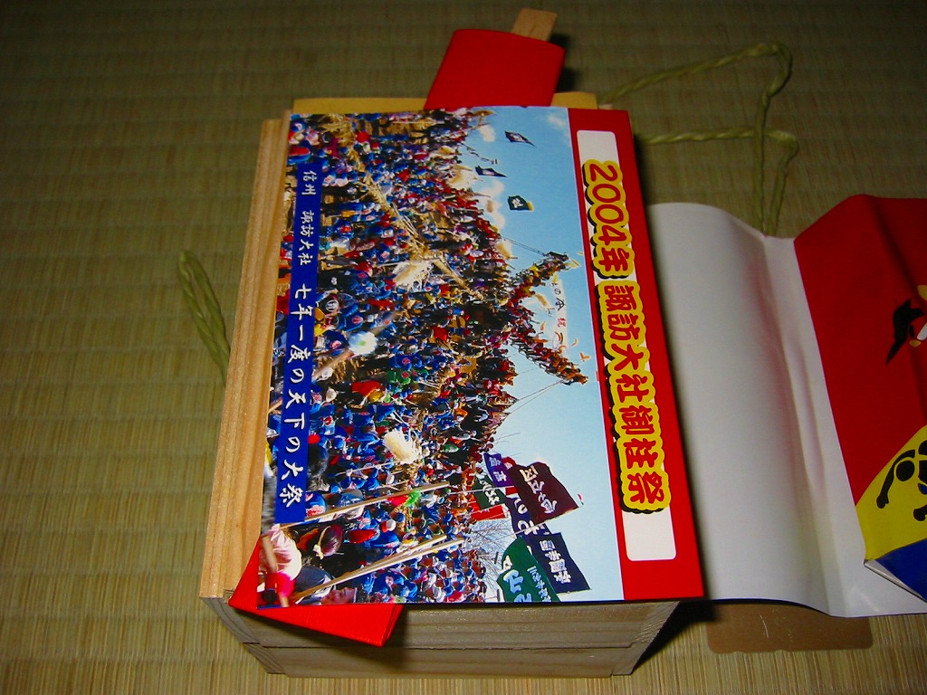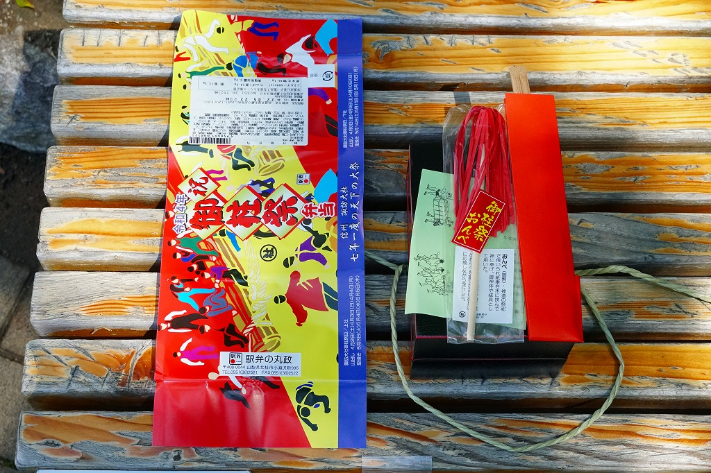 2004(平成16)年1月に発売、おそらく5月に消える期間限定駅弁。間伐材利用の二段重ね木箱に割りばしと写真絵葉書を載せて掛紙をかけて綱でしばる。中身は下段に鰻ときぬさやが載った「祭ちらし寿司」、上段に諏訪湖のワカサギ佃煮、桜肉(馬肉)しぐれ煮、豚餅米包み蒸しなど多種多様。デザートに新種カリンの果肉羊かんが入る。信濃各地の食材を使用した甲斐の国の駅弁屋の駅弁。