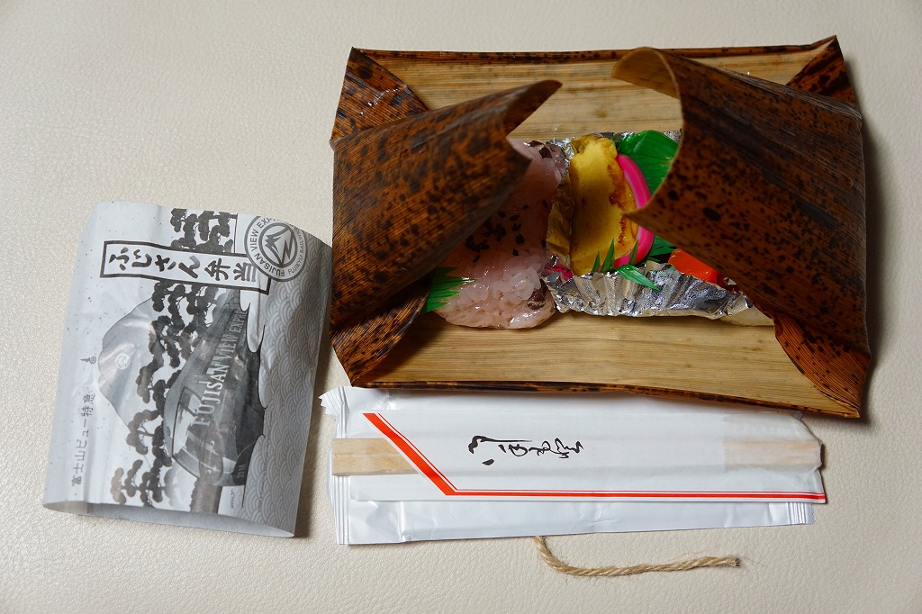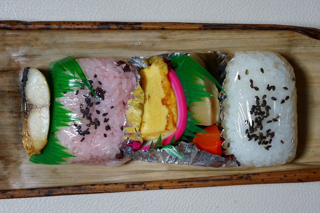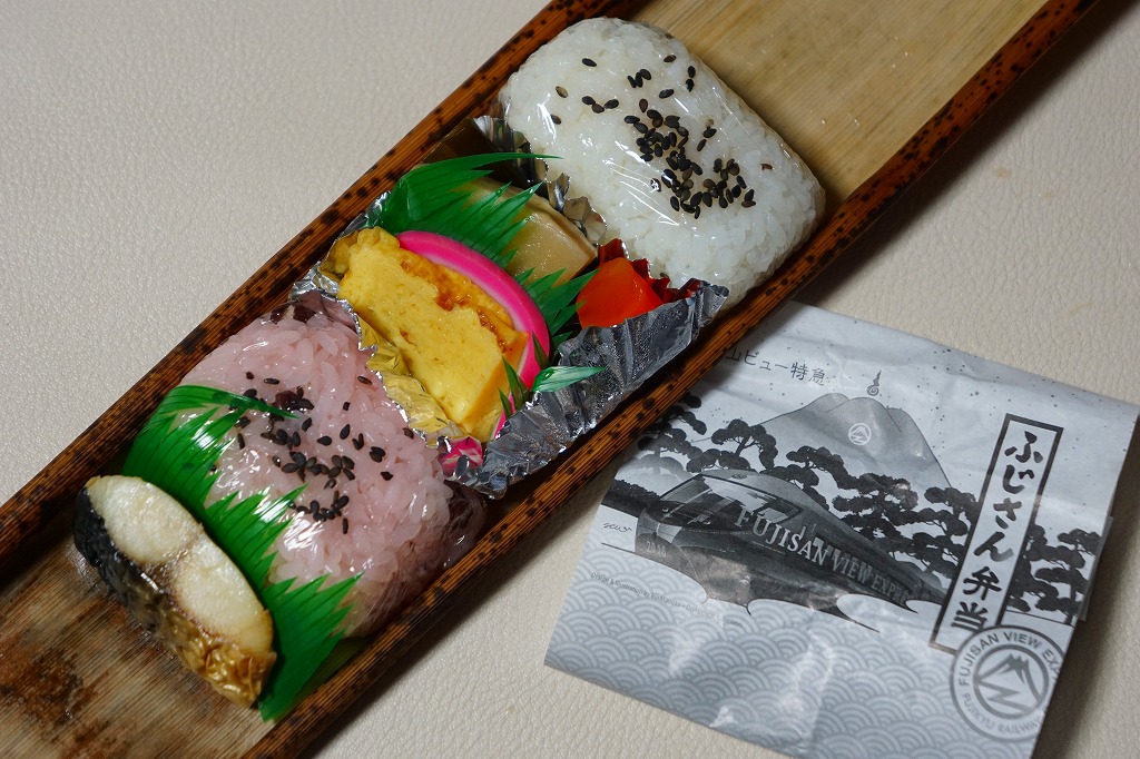 富士急行の観光列車「富士山ビュー特急」の運転開始に合わせて、2016(平成28)年4月23日に発売か。駅ではなく、同列車と「富士登山電車」の車内でのみ売られるお弁当。紅白のおむすびと、焼サバとかまぼこと玉子焼と筑前煮を、竹皮で包み、富士山ビュー特急のイラストを描いた掛紙を巻く。