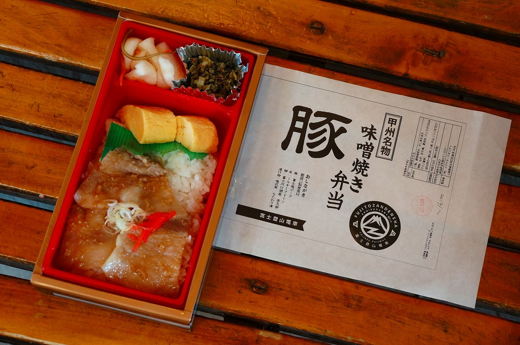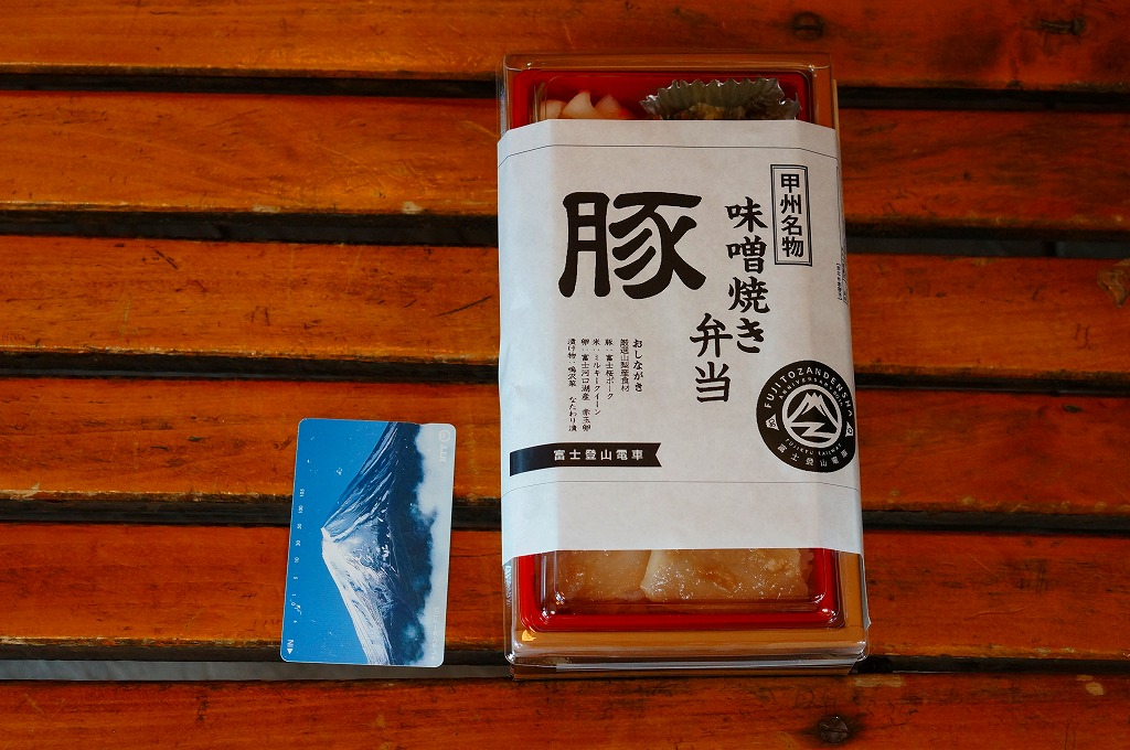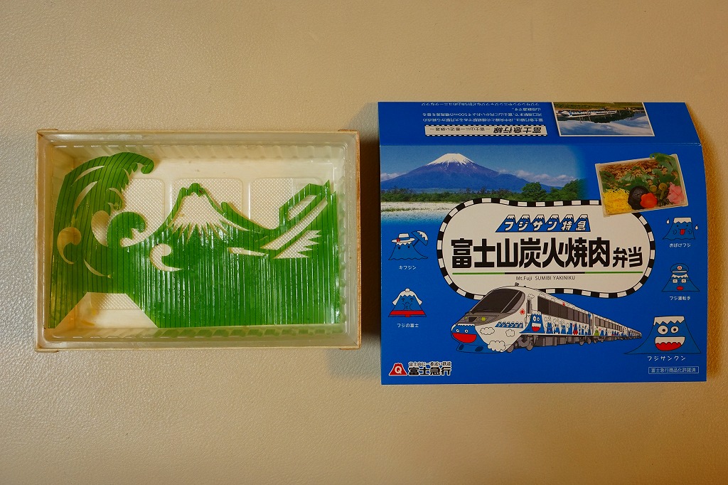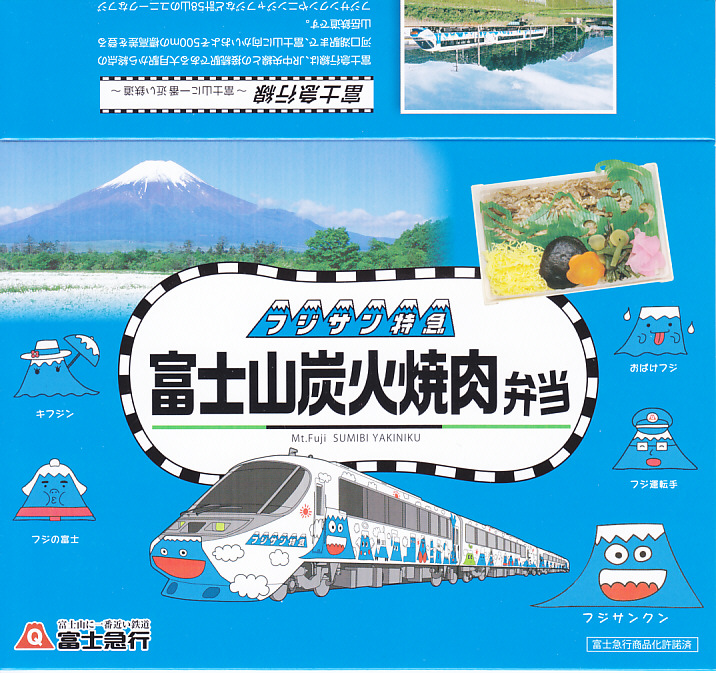 掛紙には「富士登山電車」の文字とマークがある。京王電鉄から買ってきた中古車を、デザイナーを入れて徹底的に車内を改造し、2009年8月に登場した観光列車。車内で駅弁の販売はないが、床や椅子や窓枠に明るい木材を使用した車内、アテンダントの乗務、車窓案内や下吉田駅での観光停車など、富士山麓の鉄道移動を彩る仕掛けが詰まる。
