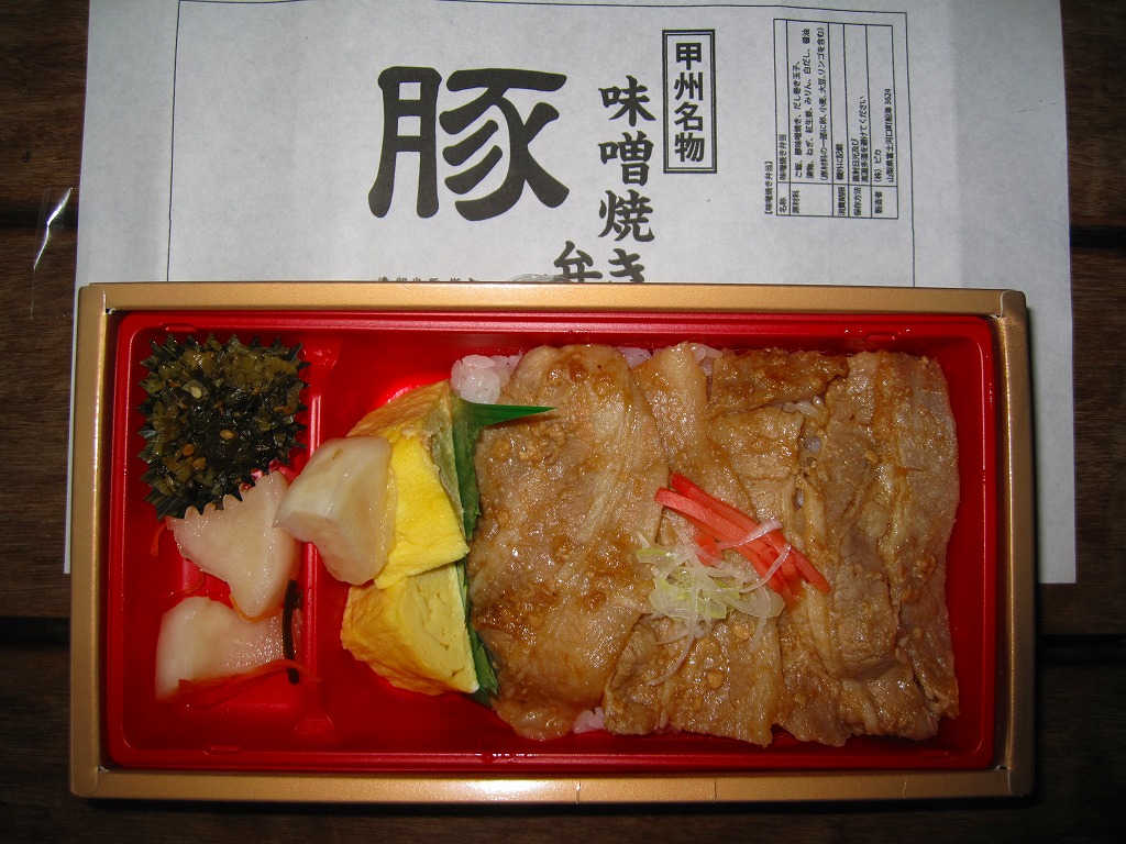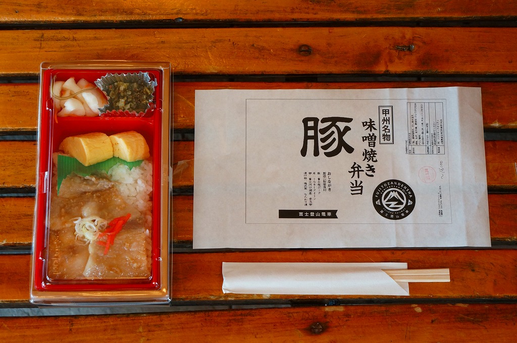 中身はミルキークイーンの白御飯の上にフジザクラポークの味噌焼きを貼り、河口湖産の赤玉卵を使った玉子焼を収め、鳴沢菜のなたわり漬けを添えるもの。山梨県産の食材をふんだんに使ったという。見栄えにこそ工業製品の雰囲気があるが、分量も常温での味もやや上品な感じ。