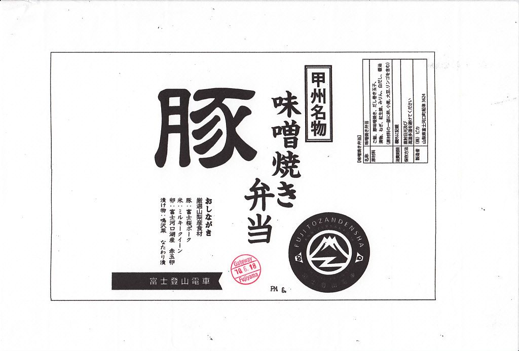 2010(平成22)年3月21日の河口湖駅構内イベント「春の富士急のりものフェスタ」で売られた、富士急行線内では初めての駅弁。ボール紙でできた長方形の箱に透明なふたをして、駅弁の名前やおしながきなどを書いたモノクロの掛紙を巻く。