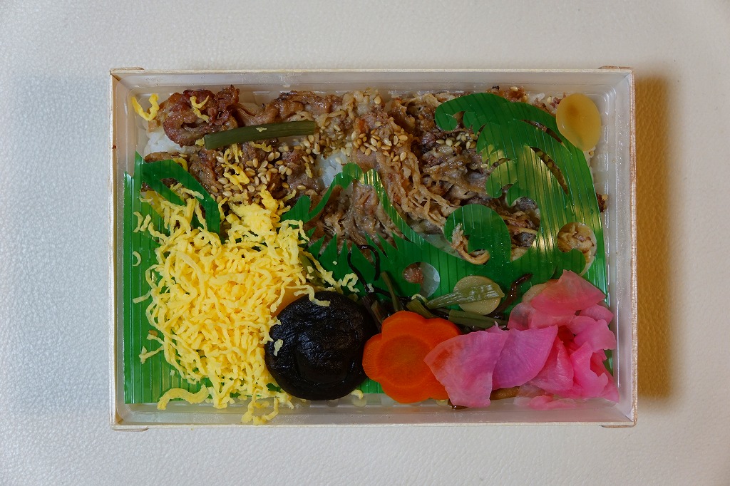 中身は、白御飯を牛肉煮、錦糸卵、シイタケ煮、ニンジン煮、山菜、ダイコン桜漬けで覆うもの。食べる部分だけ見れば、肉の味は良くても量が少なくて淋しい、三流の牛肉駅弁。肉と具を仕切るバランの形状がお見事で、これは外国人に人気の観光地にふさわしい。2017年までの販売か。