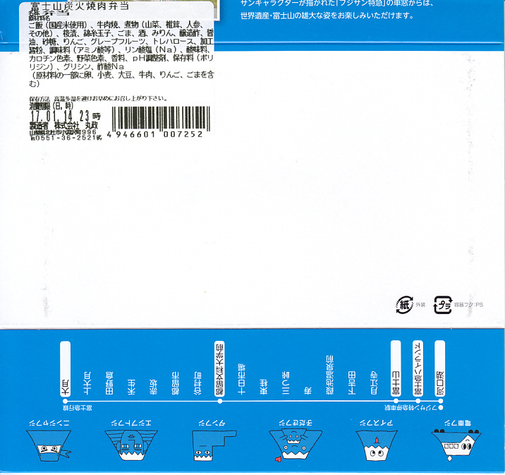 2016(平成28)年10月15日の発売か。調製元はJR小淵沢駅の駅弁屋。従前から河口湖駅のエキナカのカフェの店頭で実施されていた、小淵沢駅弁の主張販売の取扱商品に加わったのではないかと思う。水色のパッケージには、大月駅と河口湖駅を結ぶ富士急行の観光列車「フジサン特急」のイラストや停車駅付き路線図などが描かれる。