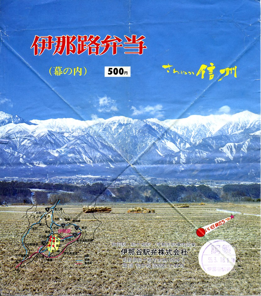 1980(昭和55)年3月18日の調製と思われる、昔の飯田駅弁の掛紙。伊那谷から見た日本アルプスの山々の写真がフチなしで大きく掲載される。この名前の幕の内駅弁は、背景の写真を変えながら長らく、飯田線沿線の主要駅に加えて普通列車の車内販売でも売られていたが、2006年1月限りで終売となった。