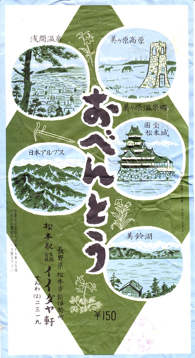 1960年代の調製と思われる、昔の松本駅弁の掛紙。美ヶ原高原、浅間温泉、国宝松本城、日本アルプス、美鈴湖を描いて、旅の気分が盛り上がりそうな、細長い掛紙。